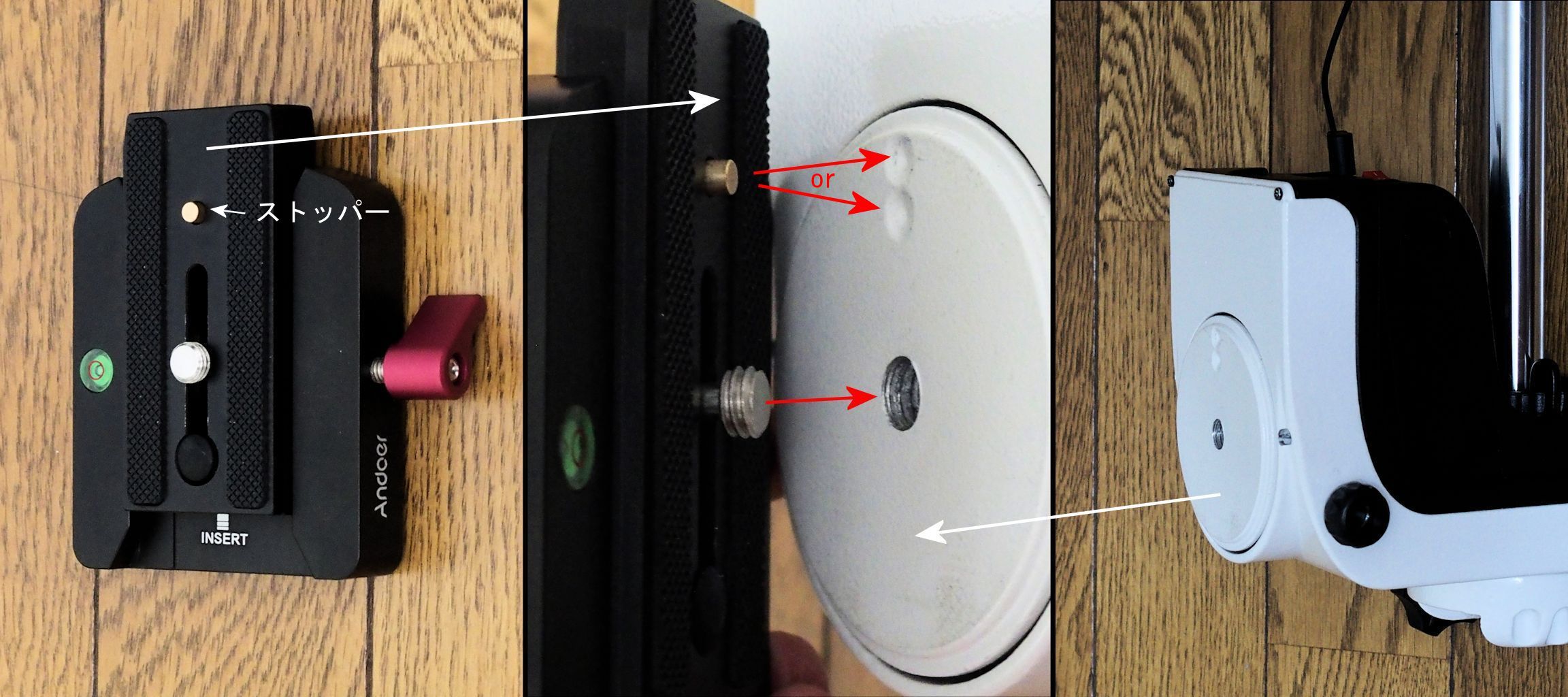 ネジ、ボルト類の接続箇所が多くなりますので全て確実に締め付けることが重要です。試行錯誤して出来上がったのが以下の組み立て案、図1のとおりです。黄色文字は持ち合わせていた部品等の利用で、赤文字が今回新たに用意した部品です。微動雲台側のプレートとAZ-GTiの接続は3/8インチネジ一本による固定ではAZ-GTi底部とプレート面が滑って回転し緩んでしまいました。これはどんなに強く締め付けても機材の重みによる曲げモーメントで緩んでしまいます。そこで基本に立ち返ってAZ-GTiの底部周辺側にあるへこみの回転防止用ストッパーの部分を利用してプレート側についているビデオストッパー(デッポチ)の二か所で回転防止することにしました。