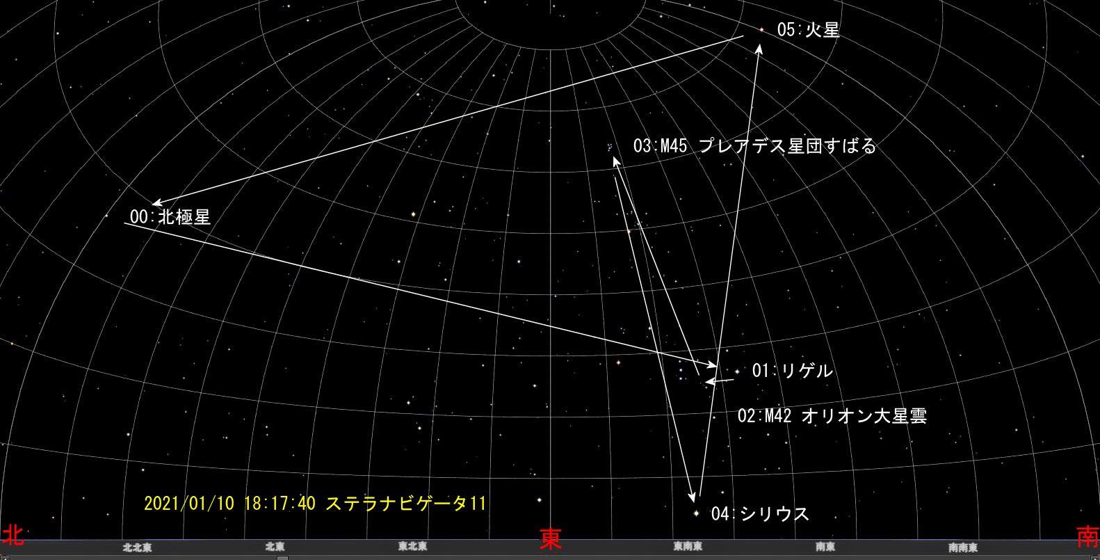 この状態から図3に示すステラナビゲータ11による星図のとおり、北極星 → オリオン座リゲル(1スターアライメント) → M42オリオン大星雲オートガイド → M45すばるオートガイド → シリウスオートガイド → 火星オートガイド → ポラリスに戻る、6ステップをiPhone 11Proにより動かしてみます。途中、高度と方位を望遠鏡の上にiPhone11Proを載せてSynScan内で表示される数値と比較しました(おおよその比較になります)。