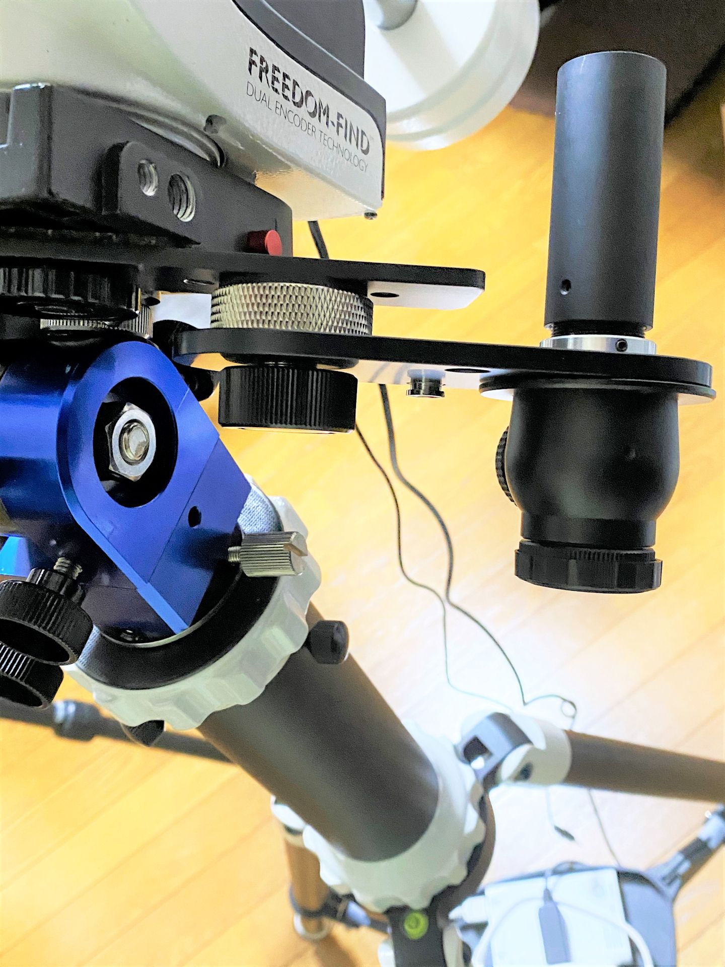 また、プレートは12cm長さのためクランプの外側に突き出していてAZ-GTiをガイド運転している際に干渉してしまいました。このため、プレート側のみを9cm長さのものを探し出し別途購入して取り付けています。なお、クランプ側の裏側に1/4インチのネジ孔を利用して極軸望遠鏡をプレートを利用して取り付けました。この極軸望遠鏡がAZ-GTiが動き回る際に干渉しますので取り外す必要があります。一度合わせてしまえばその後に行われる1スターアライメントで調整できるので問題ないと思います。その画像を図2に示します。もう少し長いプレートにすれば干渉しないように思われますが確認していません。