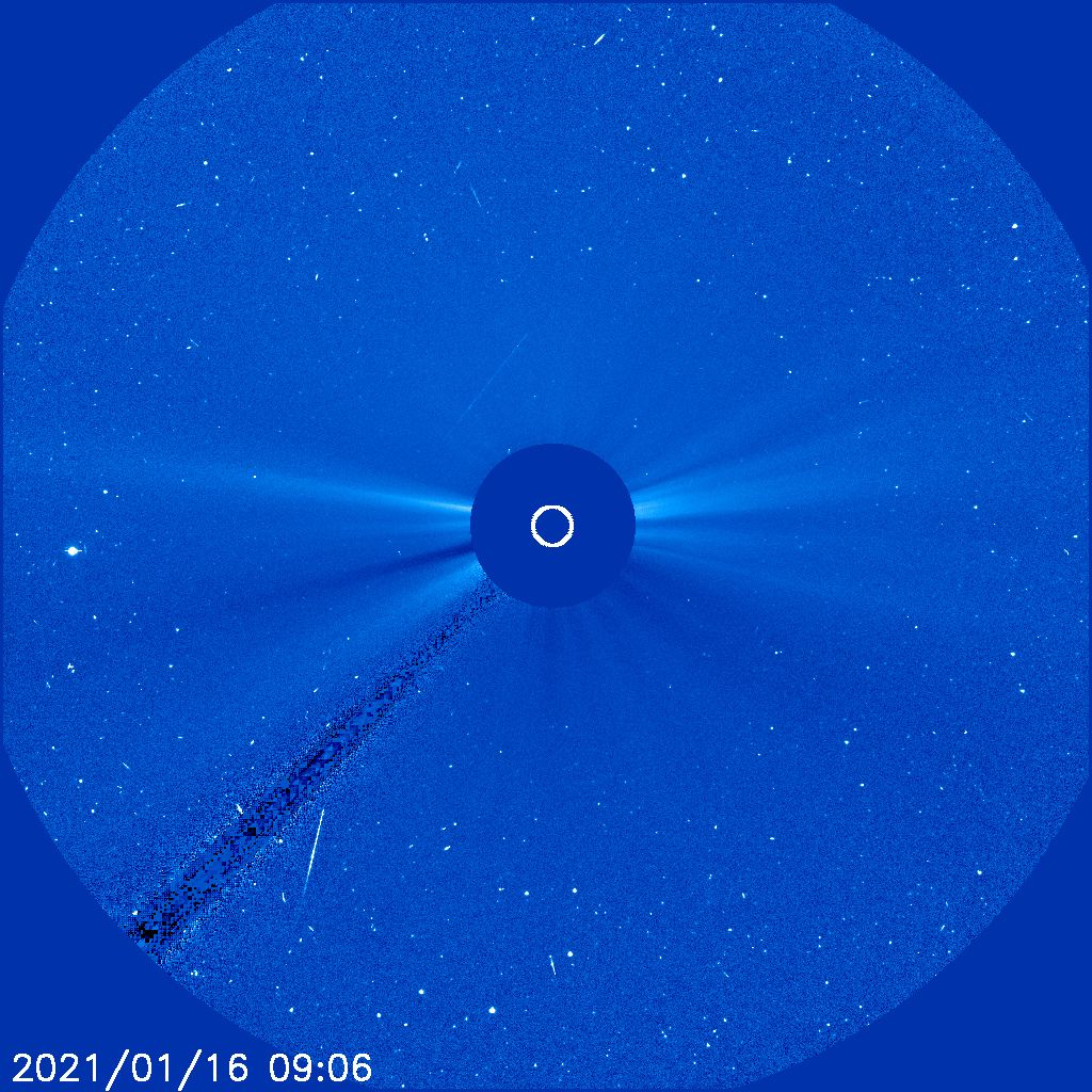 SOHO LASCO C3 の画像に土星が写り始めました。1/20頃には木星も一緒に写り、太陽を中心に捉えながらの画像で地球の公転により変化します。相対的に両惑星は右側に太陽に近づくように移動し、土星は01/24頃、木星は01/29頃には太陽の直下を通過し、月末、2月初旬には右端に消えていきます(ステラナビゲータ)。太陽の向こう側の木星、土星を見ているので視直径は小さい。年末に木星と土星は接近して話題になりましたが、両惑星が太陽に近づくにつれて、最近は日没時の水星、木星、土星、(月)の四天体または三天体の集合写真が多いようでした。