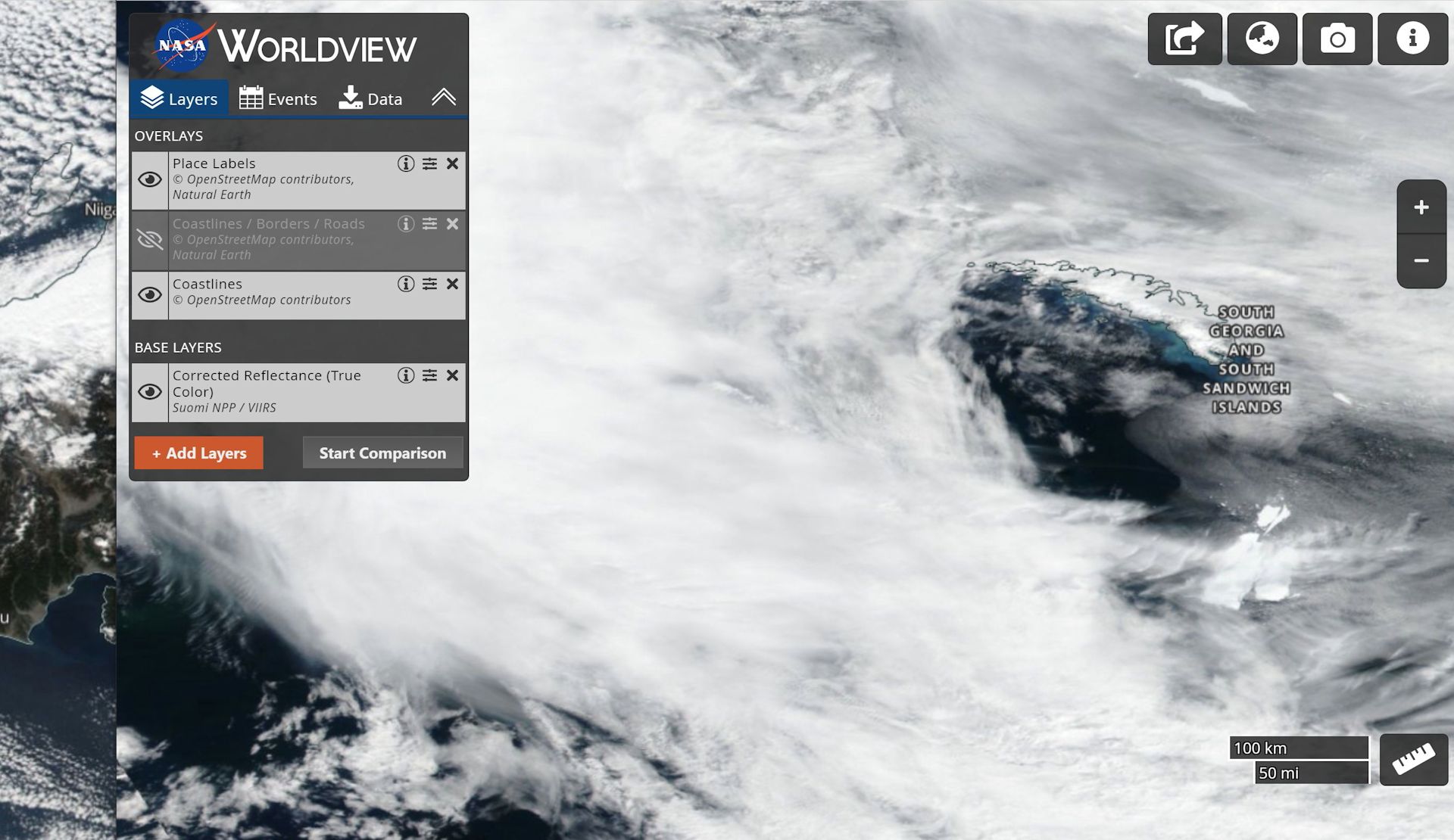 ニュース等で南大西洋で南極大陸にも近いサウスジョージア・サウスサンドウィッチ諸島に巨大な氷山が近づき大丈夫なのかとの情報を目にしました。宇宙からどう見えるのだろうと、そこで、NASAが公開しているEOSDIS Worldview (nasa.gov)で衛星SUOMIの画像を元にその氷山の動きを追跡してみました。2020/12/01~2021/01/08の毎日一枚の画像を動画に編集。動画は氷山の動きの様子がわかるように高速で変化させています。背景が不連続に変化して見えますので目が疲れるかも知れませんので注意(自身だけかも)。氷山に注目してその動きを残像として捉えると良いです。