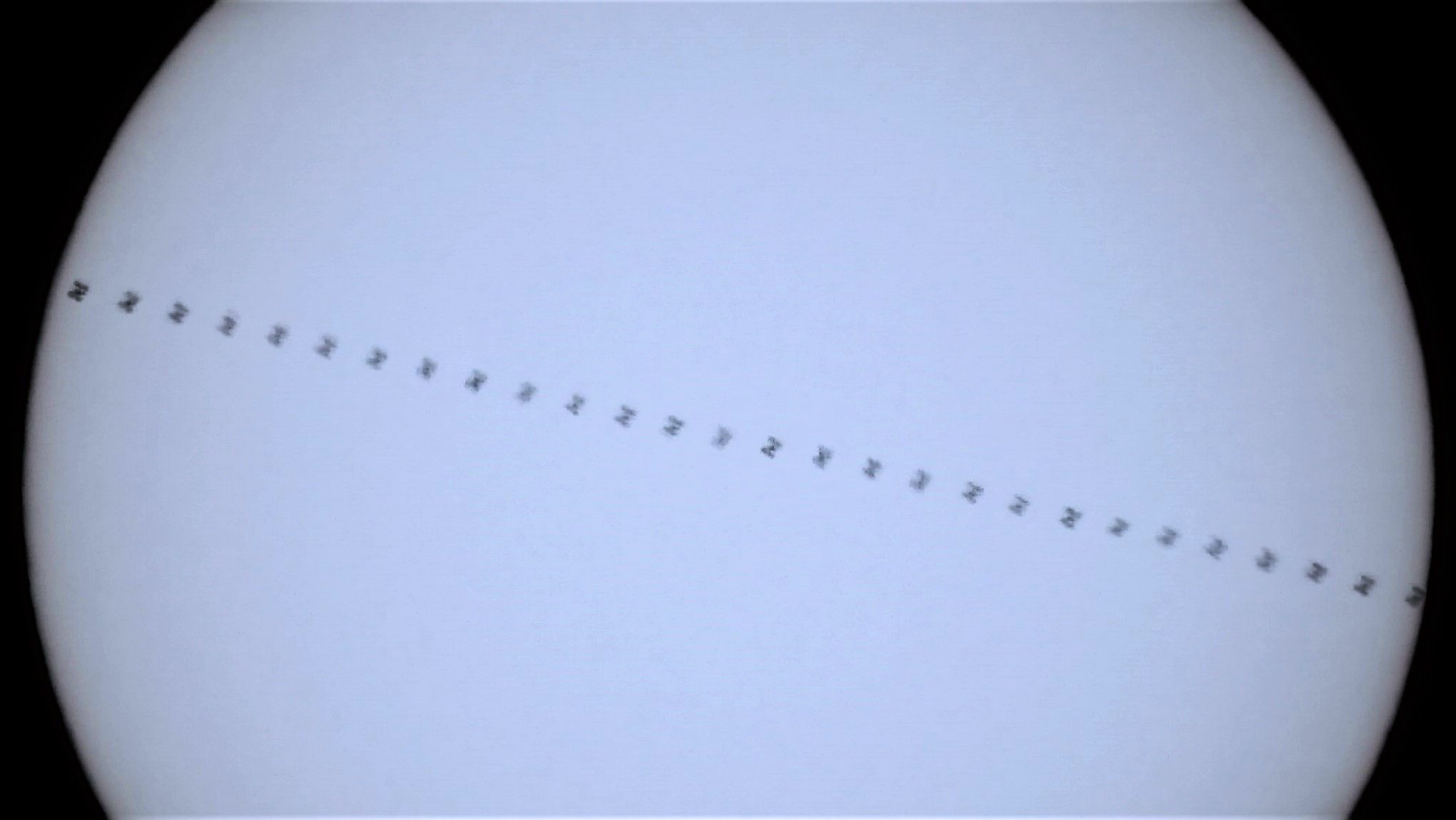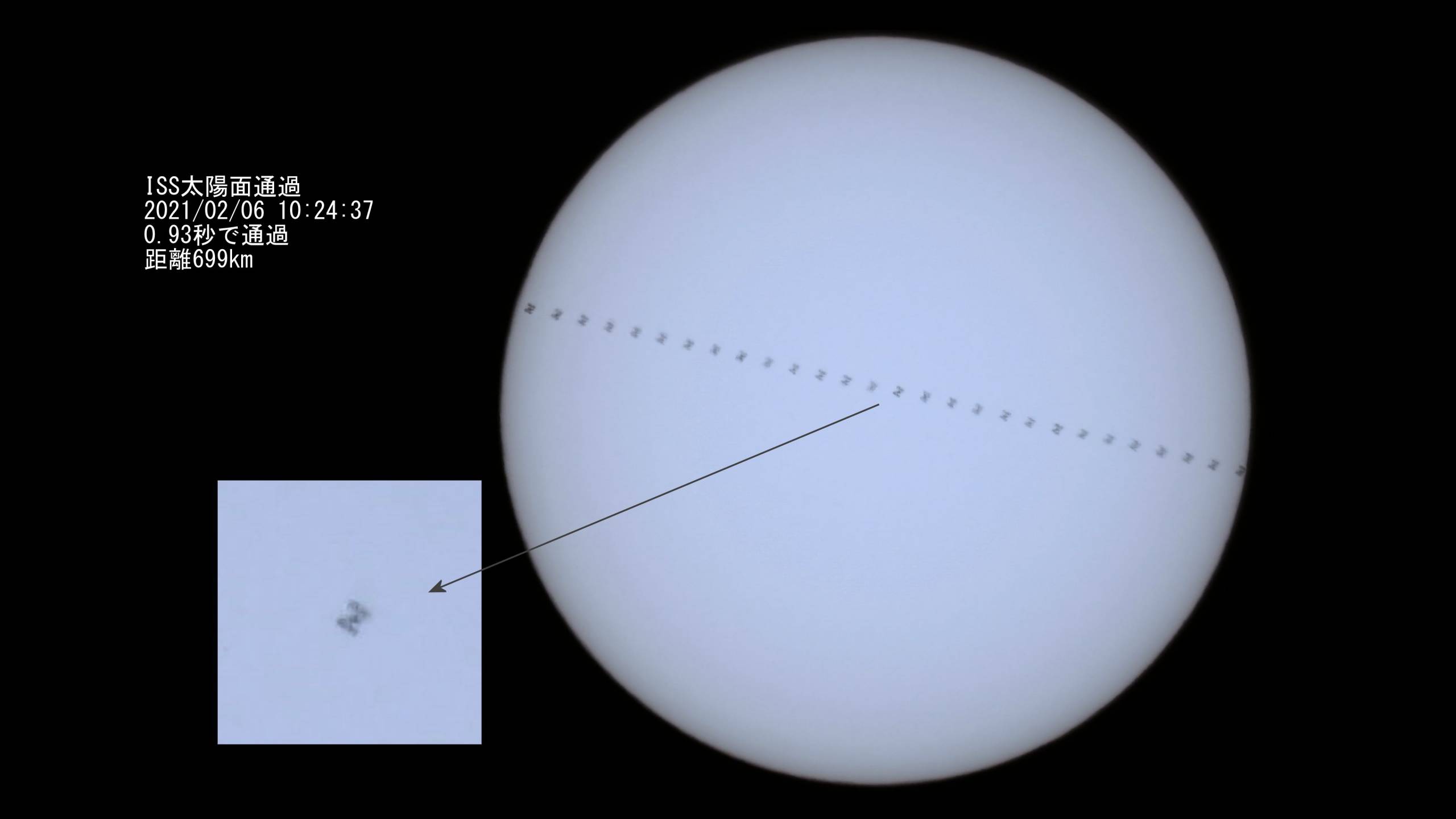 今日は午前と夕方の2回ISS拡大撮影のチャンス。まず午前の部として太陽面通過でしたので載せます。ISSは見えませんが太陽を通過した時だけ瞬間に影として見えます。日食と同じことです。COOLPIX P1000でISO-125 f/6.3 1,800mm 1/1600秒/1コマ ND100000フィルターの4K動画で撮影しました。PIPPで太陽センタリング前処理し、ISS通過前後を含めて5秒間の映像(2021/02/06 10:24:34~10:24:39)として切り出しました。半年前に撮影した太陽面通過No.744よりも距離が遠くISSが小さく映っています。0.93秒間で太陽面を通過しました。(4Kからハイビジョン級2Kの動画にしています)