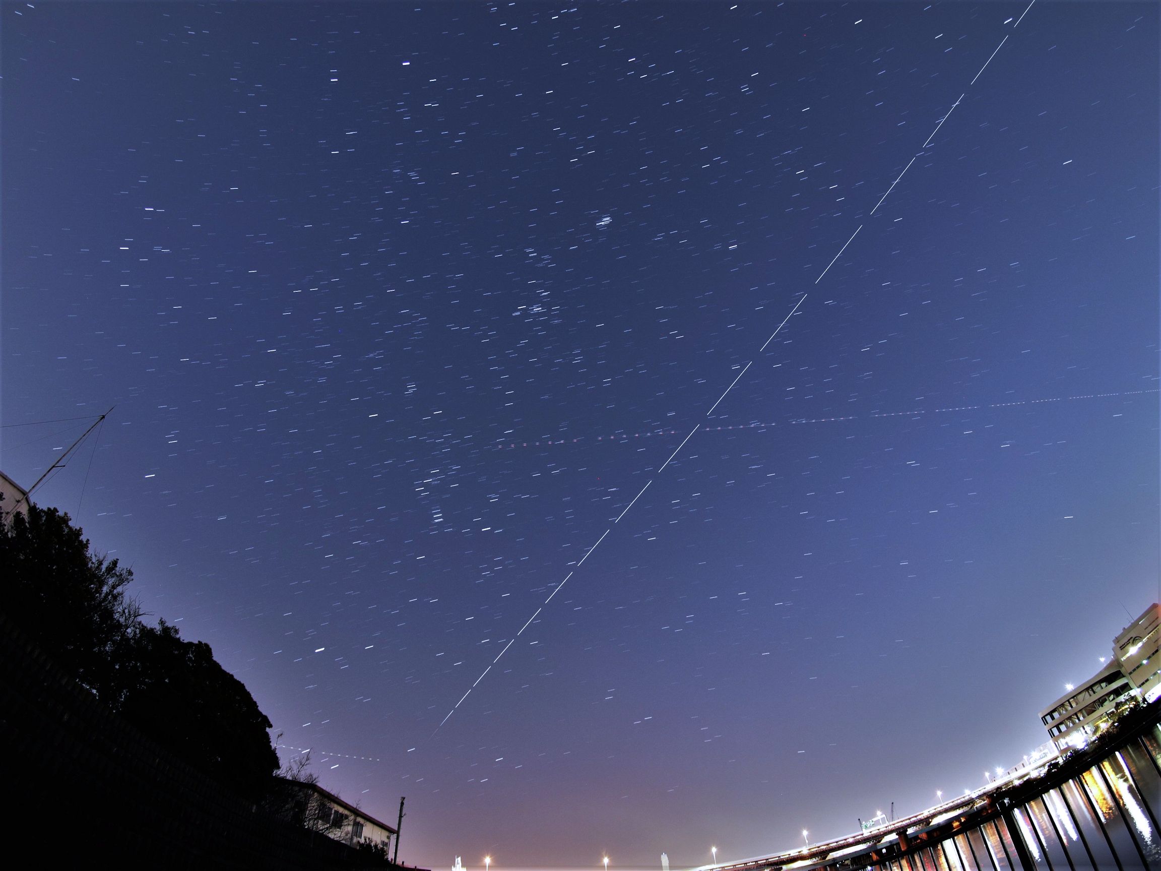 EOS M6による光跡写真です。南の空は、瞬間にオリオン、シリウス、スバル、アルデバランとわかる、それに火星、ふたご座、うお座等いろいろと豊富。その中を最高高度から南東に直線的に進むISSとして捉えられました。