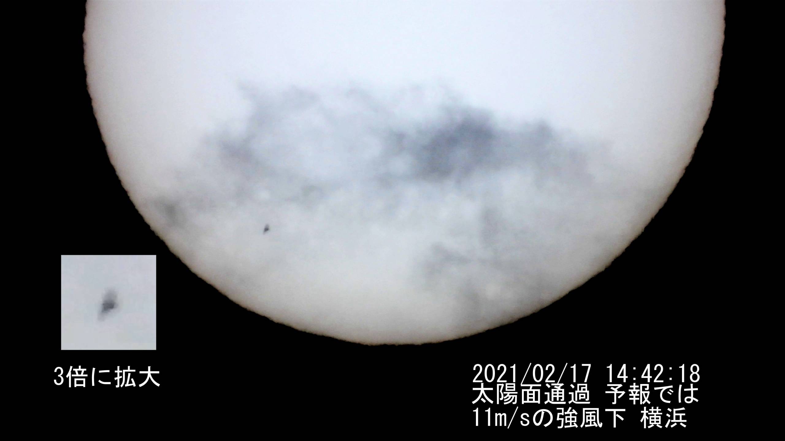 ISSまでの距離は約810kmと遠く、それに最悪の天候、強風11m/s。通過時刻に強風に攻められ、結果としてピント合わせは困難、映像はビンビンと跳ねました。さすがにモニターでは良くわからずボツにしようと思いましたが、大きな画面では薄い雲の中に写っているではありませんか。良い例ではありませんが太陽面を通過を九州、四国を北西から南東に抜け太平洋上空に出る飛行コースで横浜からも見えましたとの証拠。