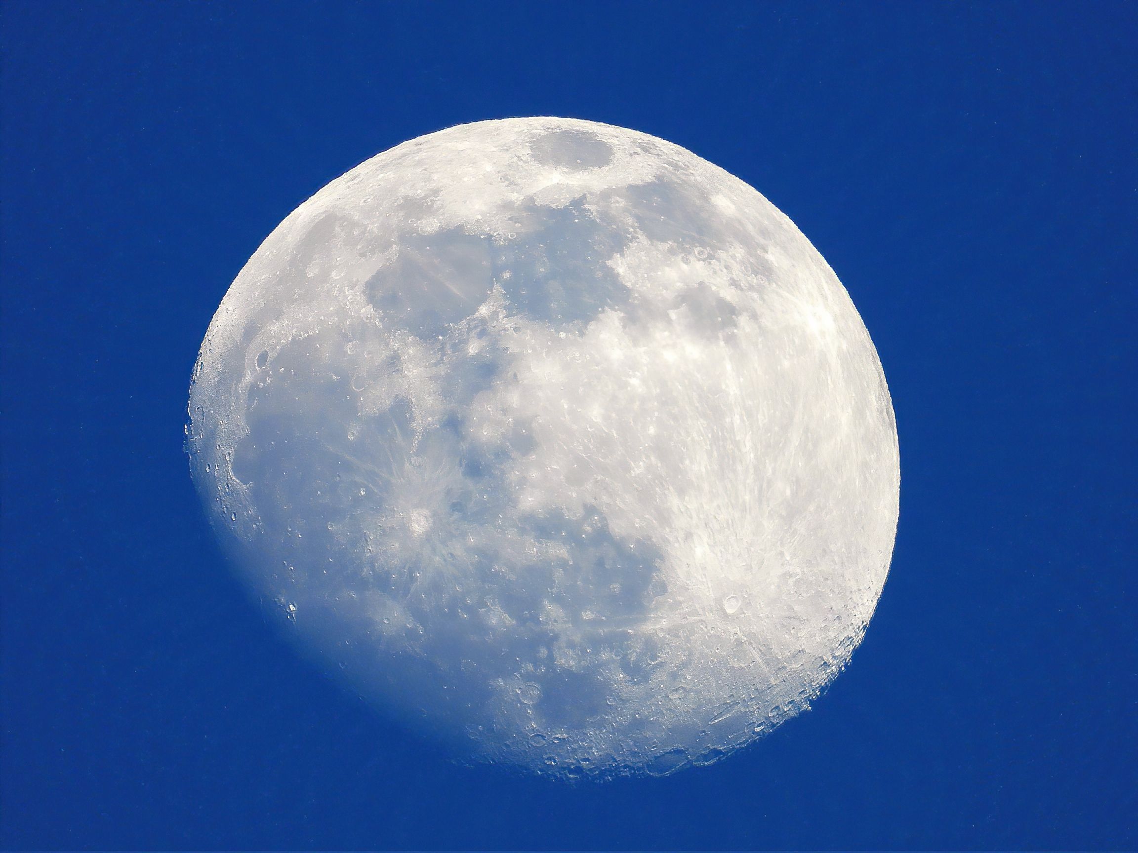 月齢12.5、満月までもう少し。日没前の明るい空の月の撮影は難しい、いまだにキレイに撮れた感触を味わったことがありません。2021/02/24 17:11 COOLPIX P1000 ISO-100 432mm(2,400mm) f/7.1 1/160秒 RegiStax6でWavelet変換、DenoiseAI処理。