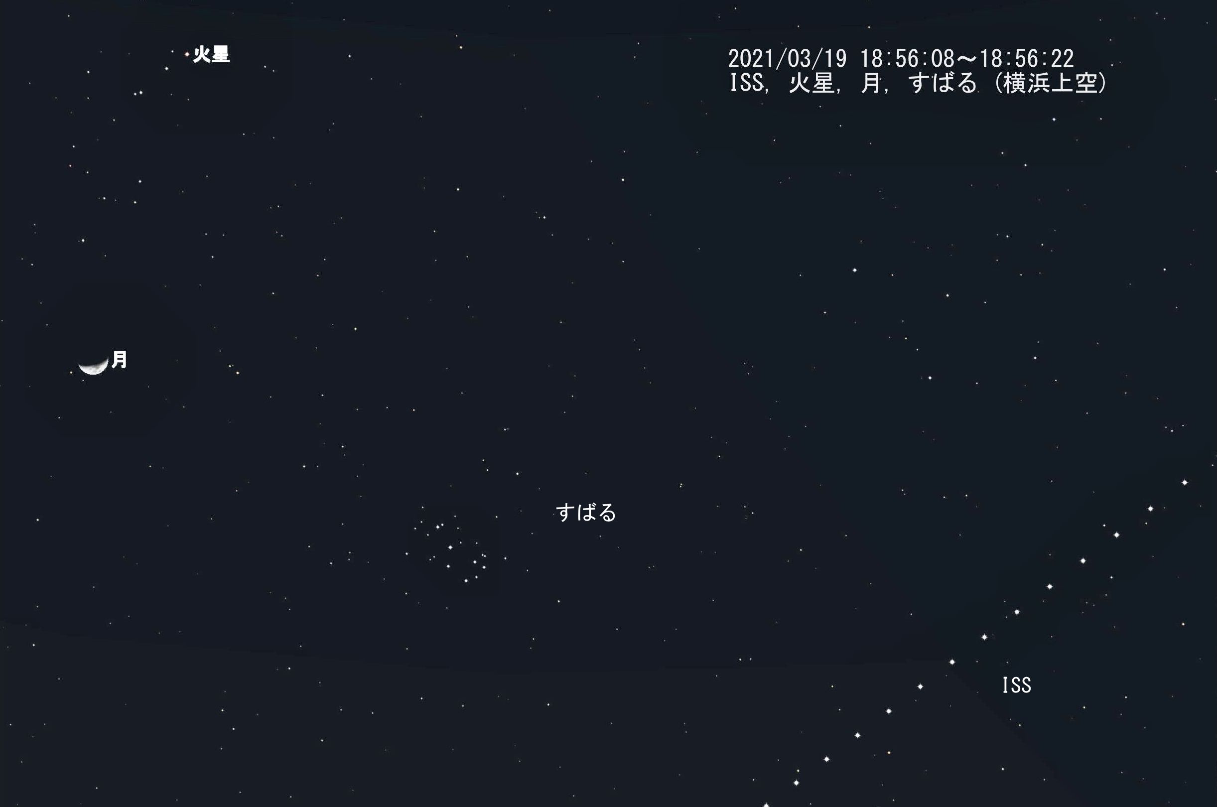 やっとISS夕方周回モードがやってきました(早朝はその限りではありません)、楽しみです。一番面白そうなのは2021/03/19の夕方、ISS, 火星, 月,すばるの四天体同時撮影。APS-Cカメラの100mmレンズで撮った場合の予想される画像をステラナビゲータで作画。焦点距離100mmでも星々は線状になってしまいますので18:56:08の星空を代表としてそれにISSの一秒間隔の位置を表示しました。70mm程度にすれぱ左にヒヤデス星団も入ります。この後、30秒~40秒後に最大高度53°ですので拡大撮影も楽しめます。