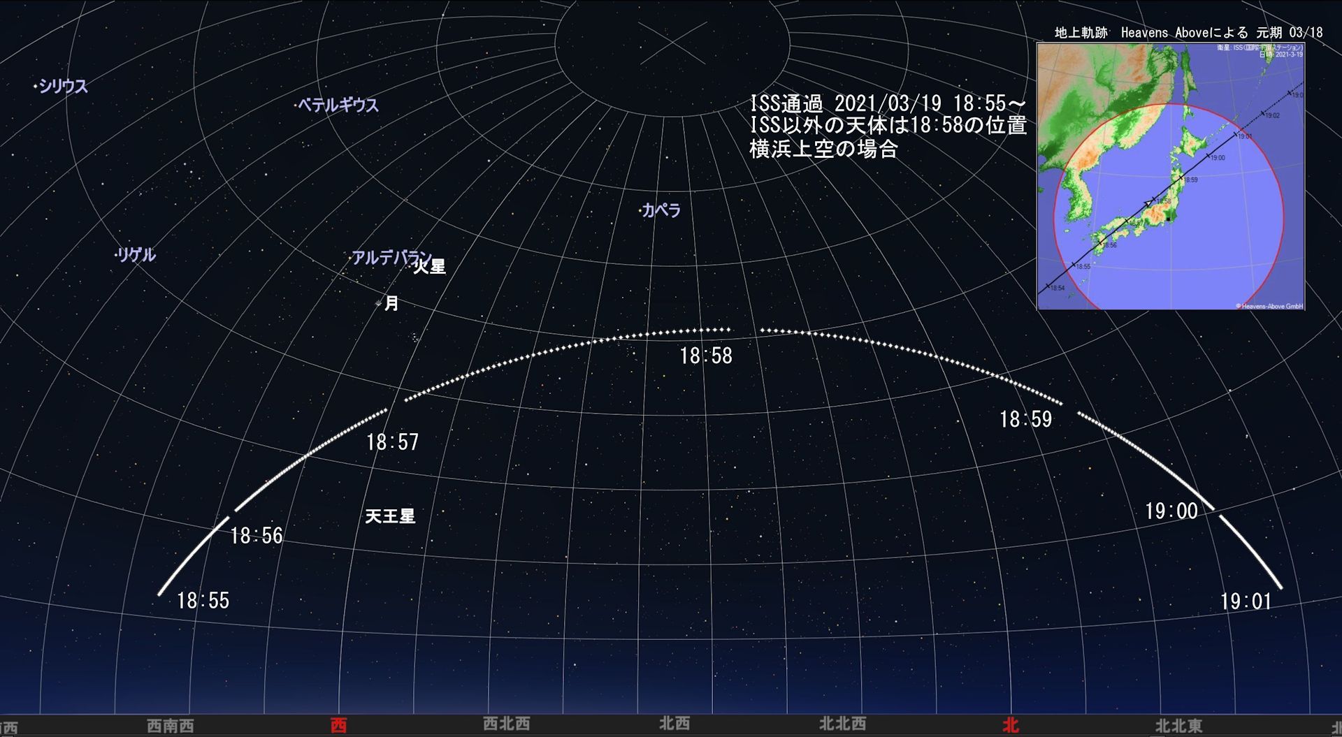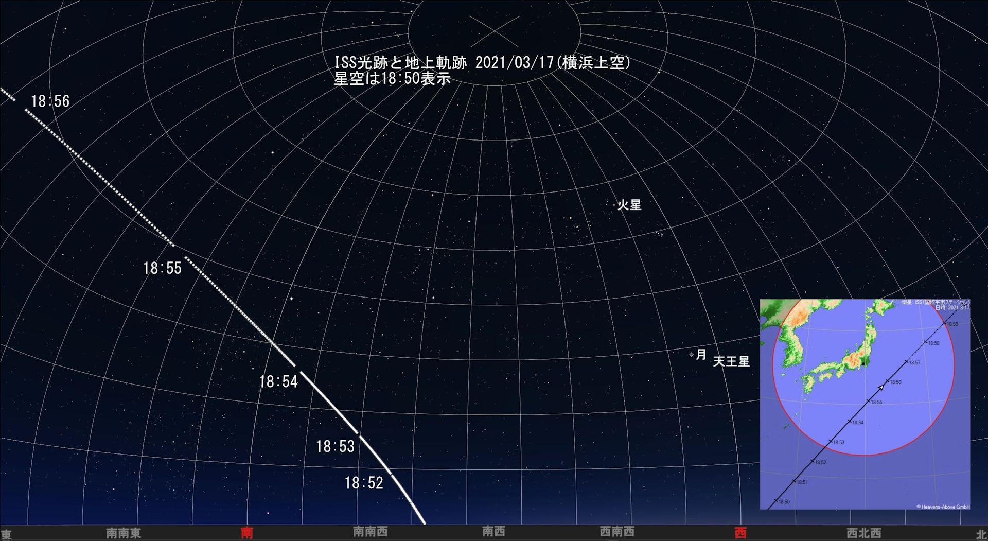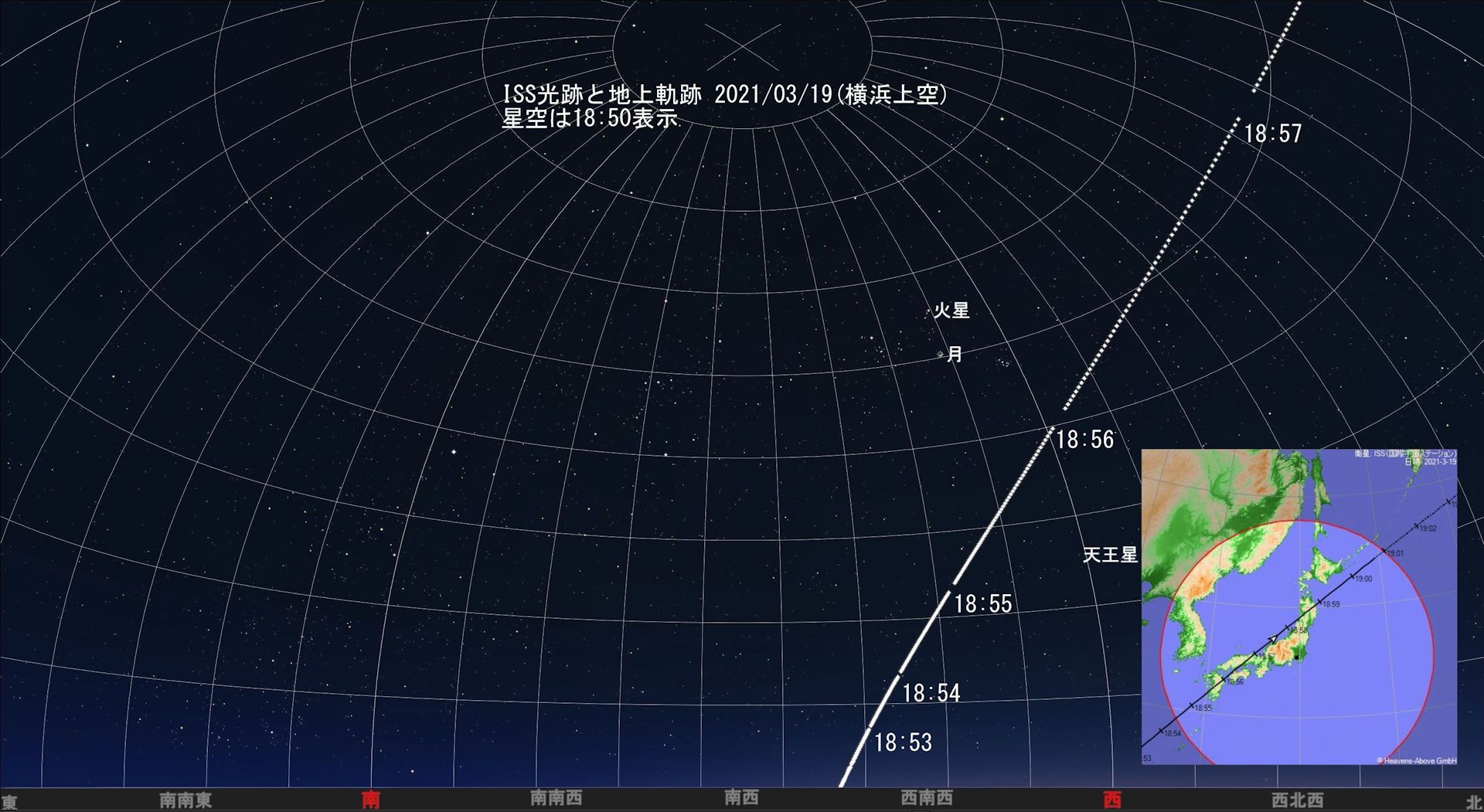 (追加 03/17日分の最終確認) ISSの軌道が少し変わったのでしょうか、横浜上空では18:53も20:30のいずれの通過(可視)も10秒から20秒程度早まるようです。各地を含めJAXA、Heavens Above、ISS TRANSIT FINDER等で確認すると確実です。作図は変更していません。