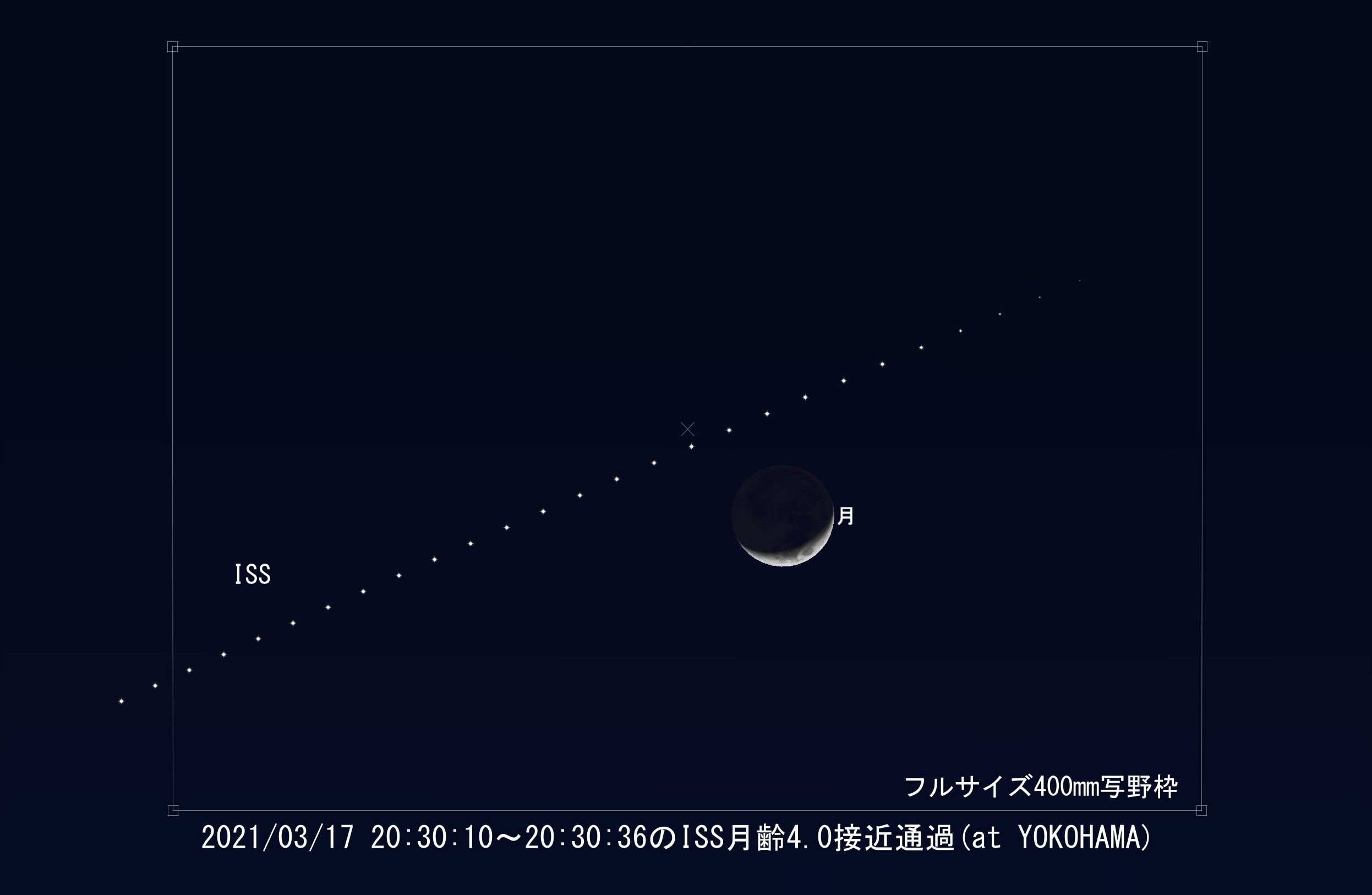 (追加:2021/03/16) 下記コメント欄にあるように坂井美晃様から教えていただきました。明日ですが、横浜地区から下記のようなISSの月齢4.0の接近通過が撮れるかも知れません(三浦半島先端からは月面通過)。以下にステラナビゲータの予想図を載せておきます。月は20:30:10(左端のISSの時点)の位置、ISSは1秒間隔表示で通過後に消えます。高度は9°と低いです。楽しめそう。