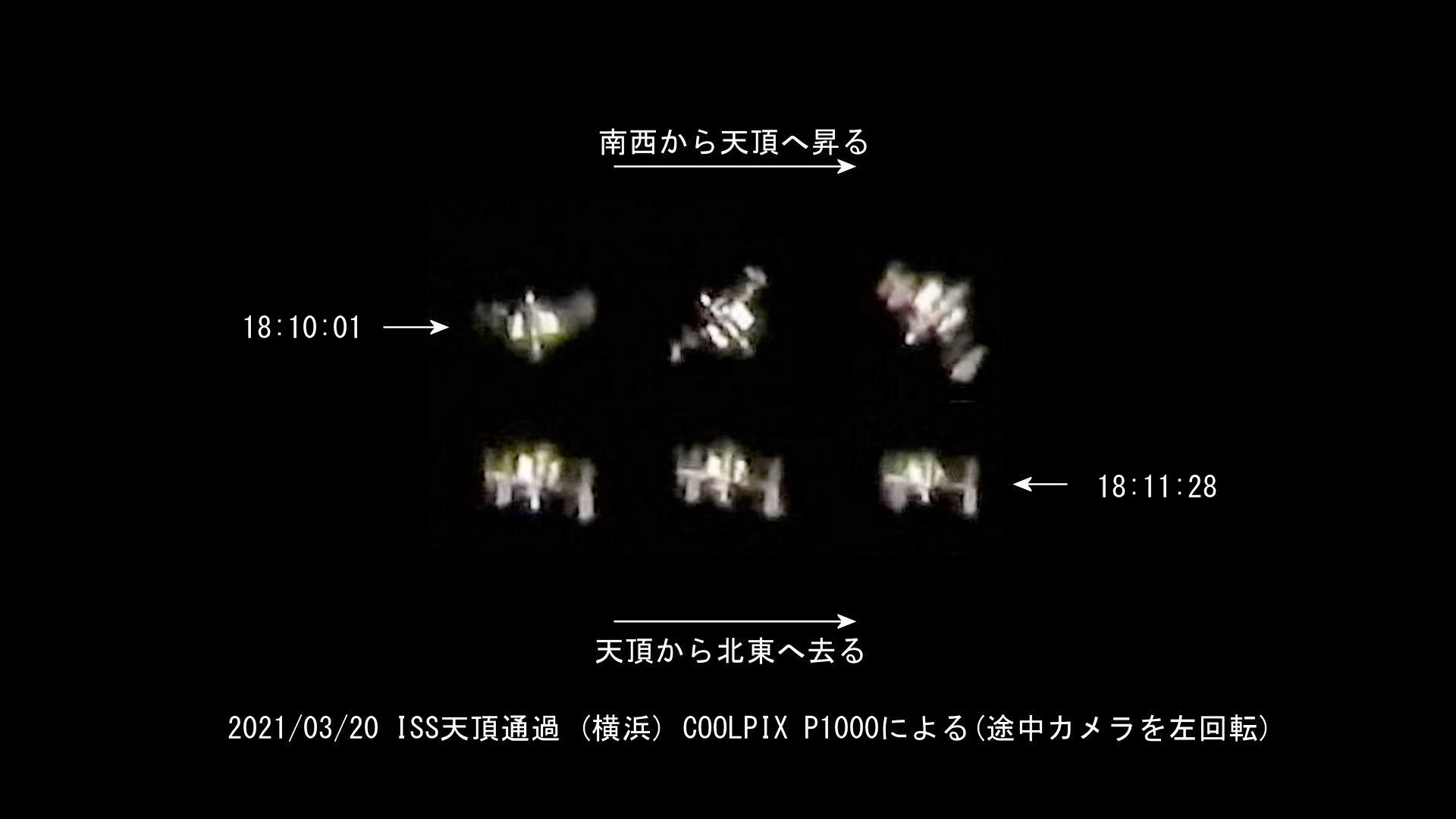 まず、その4K動画からリサイズして動画1に示します。PIPP処理でフレーム画像取り出した後、少しシャープに処理しています。PIPPによる再動画作りの方法はNo.756や特集、参考記事に載せています。南西から昇りつつあるISSに向かい撮影開始、天頂付近で構えを左に変え、以後そのまま反対側の北東へ追跡しました。動画で先端の白い部分がクルー1ドラゴンで、これを先頭にして天頂、上方向に進んでいます。天頂付近で途中左廻りに回転しながら180°反対向きになり、以後、下が北東方向への進行方向になります。天頂付近の約2分間分のフレームを25秒間(5倍速)で表示しました。COOLPIX P1000で手軽に撮れるかなり良い映りの例になりました。