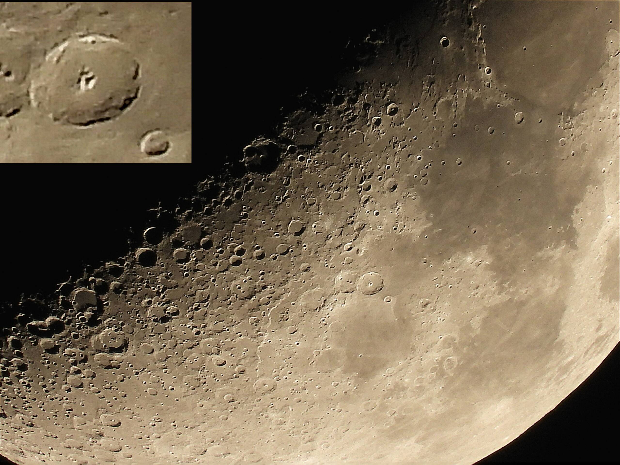 月面の「最初はグー」と思いながら撮影しました。神酒の海の西端に大きなクレーターが三つ並んでいますが、この写真では右側に写っているテオフィルス クレーターを拡大撮影したものです。その中にグーのように見えるピークがあります、左手こぶしなのかな。180°回転すると右手のようにも?。ネットで調べましたが影にもよるようですが倍率を上げて精細な画像ですと良く見えすぎてグーには見えません。ちょうどぼやけた感じでグーに見えるところが面白い。LOVEもXも同様で画像が粗いままでもかなり楽しめます。アルタイ断崖、アリアディウス谷およびアポロ11号着陸付近もこの写真の中に写っています。アリアディウス谷の極めて細い線を浮き出させると撮影した気分が味わえます。