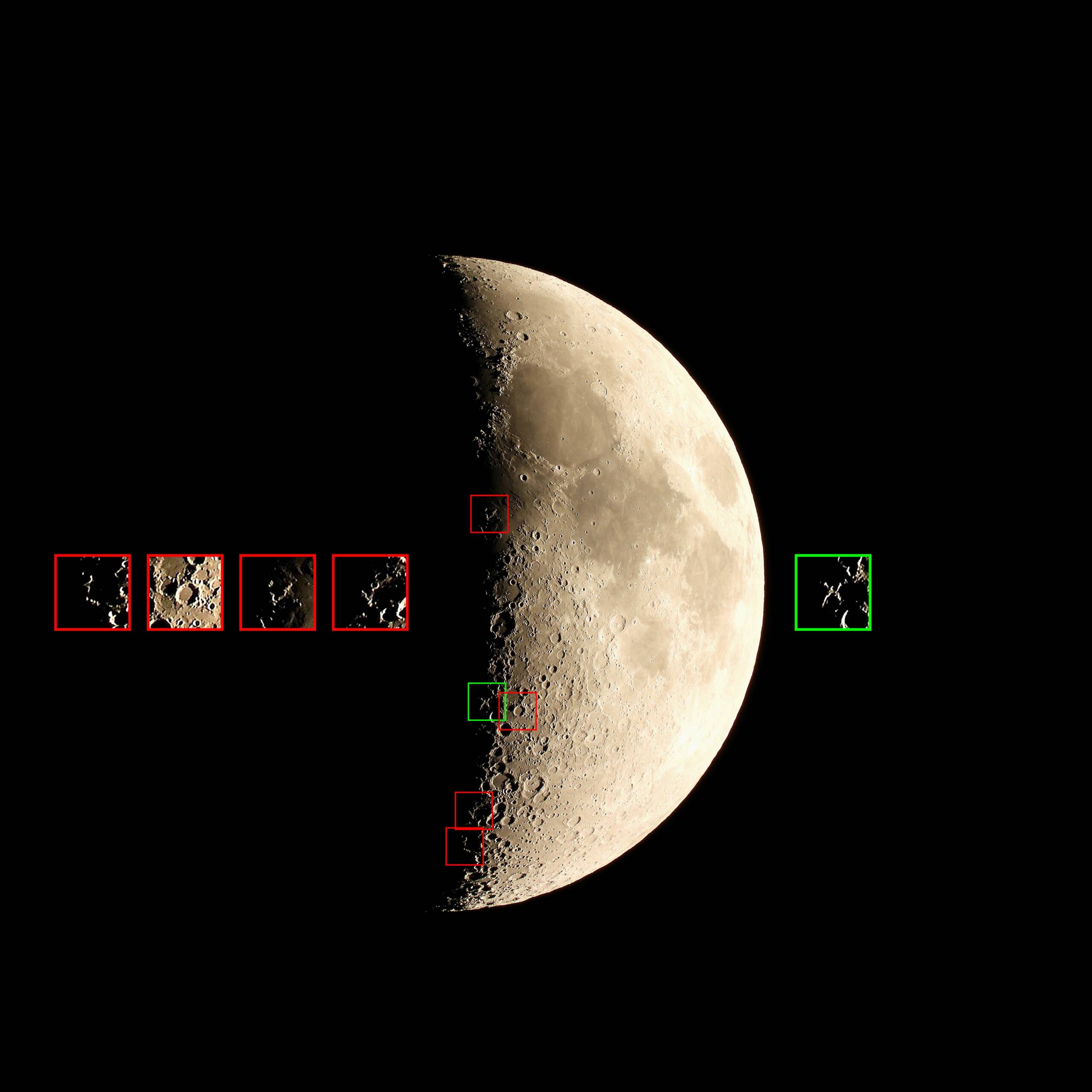 アポロ11号の着陸場所は写真中央のやや下にある二つ縦に並んだクレーターの下のすぐ右に位置しています。その上の斜めに線を引いたように見えるのがアリアディウス谷。カメラ一台でここまで撮れれば気分は良しです。