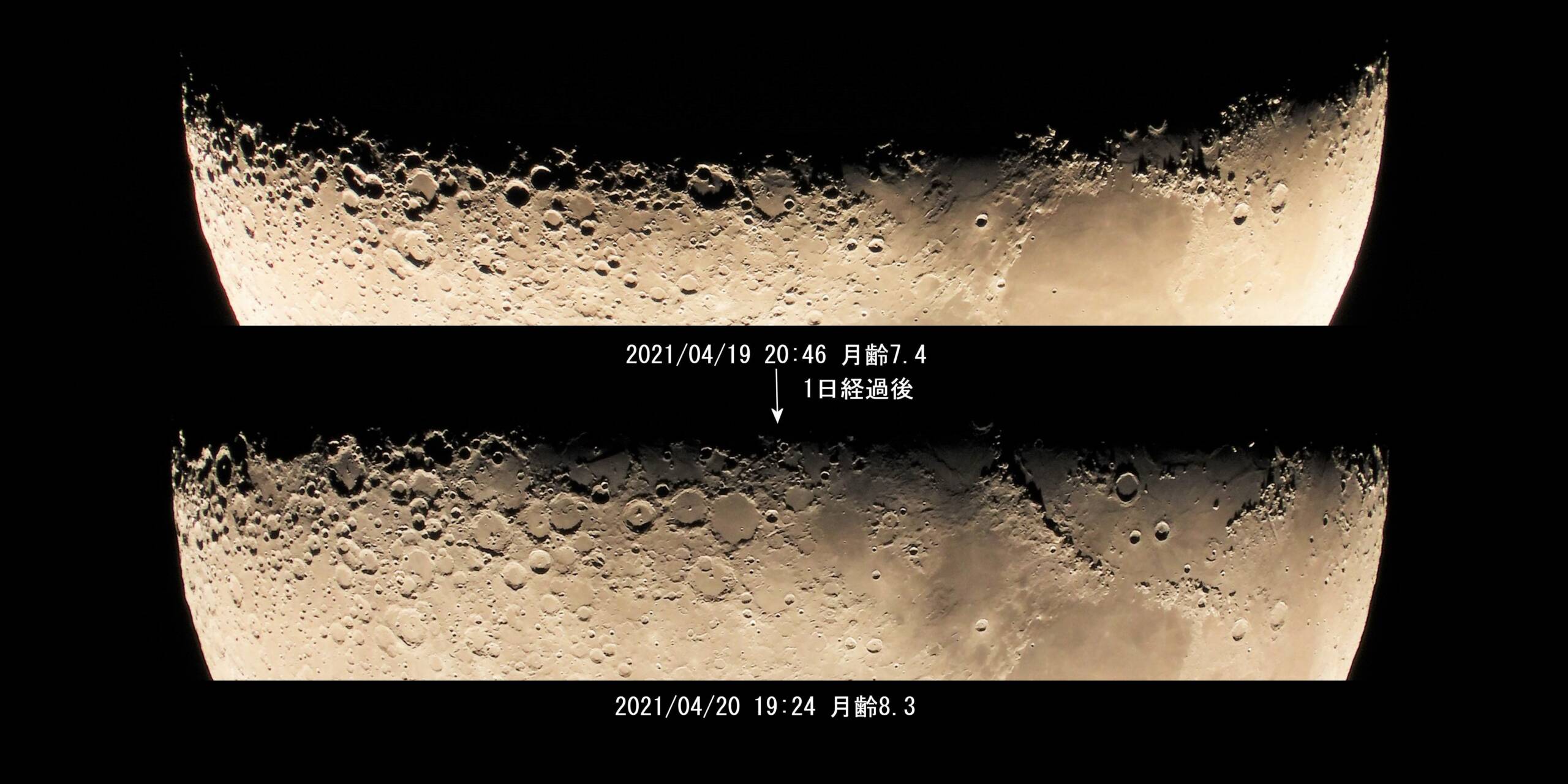 月齢7.4から一日経過していますが、どのように変化しているのか知りたく撮りました。月齢8.3を2,800mmで全体を撮り前日の月齢7.4と比較しました。前日の撮影は3,000mmでしたので焦点距離の違いを補正して画像を調整しました。