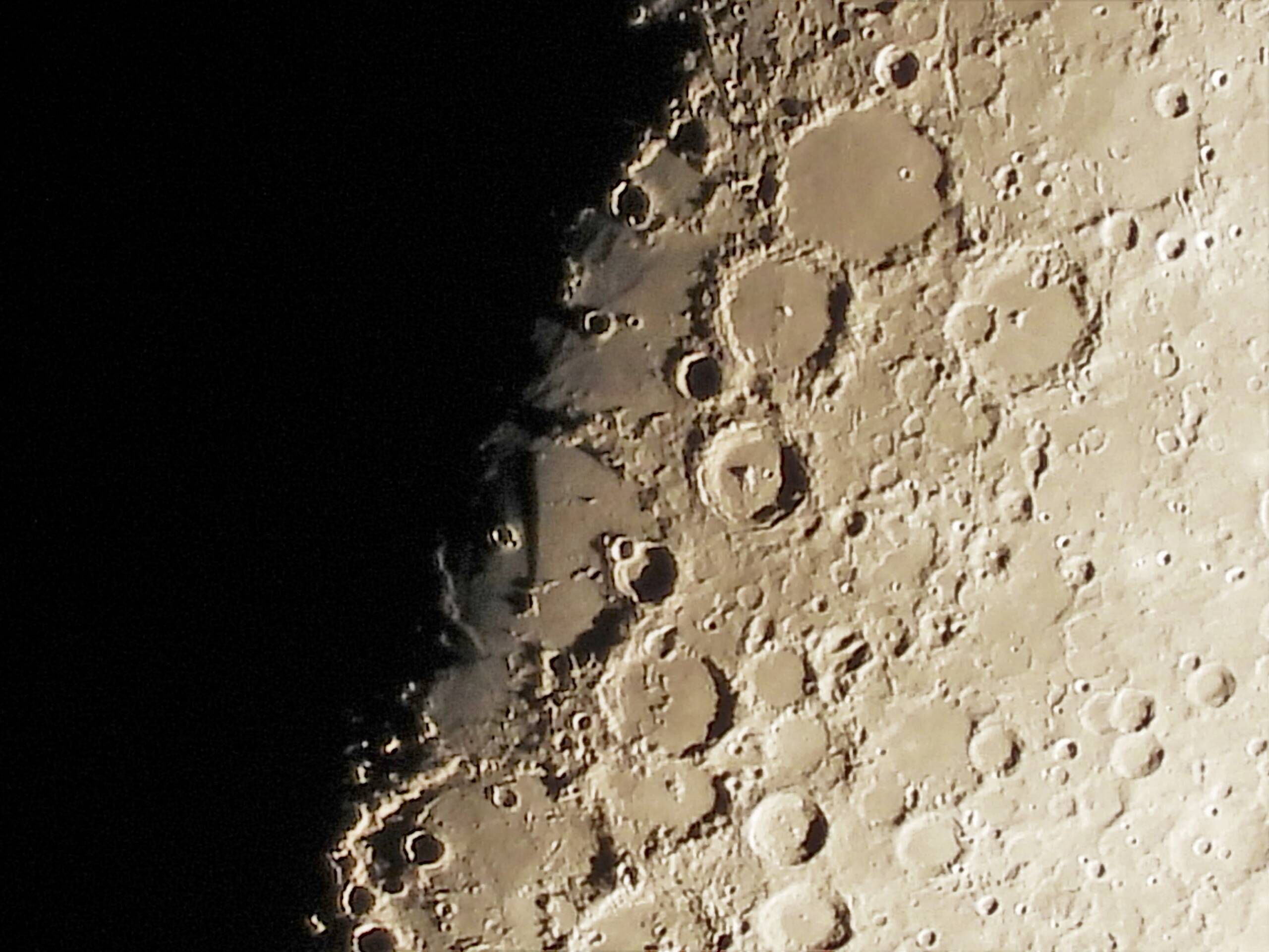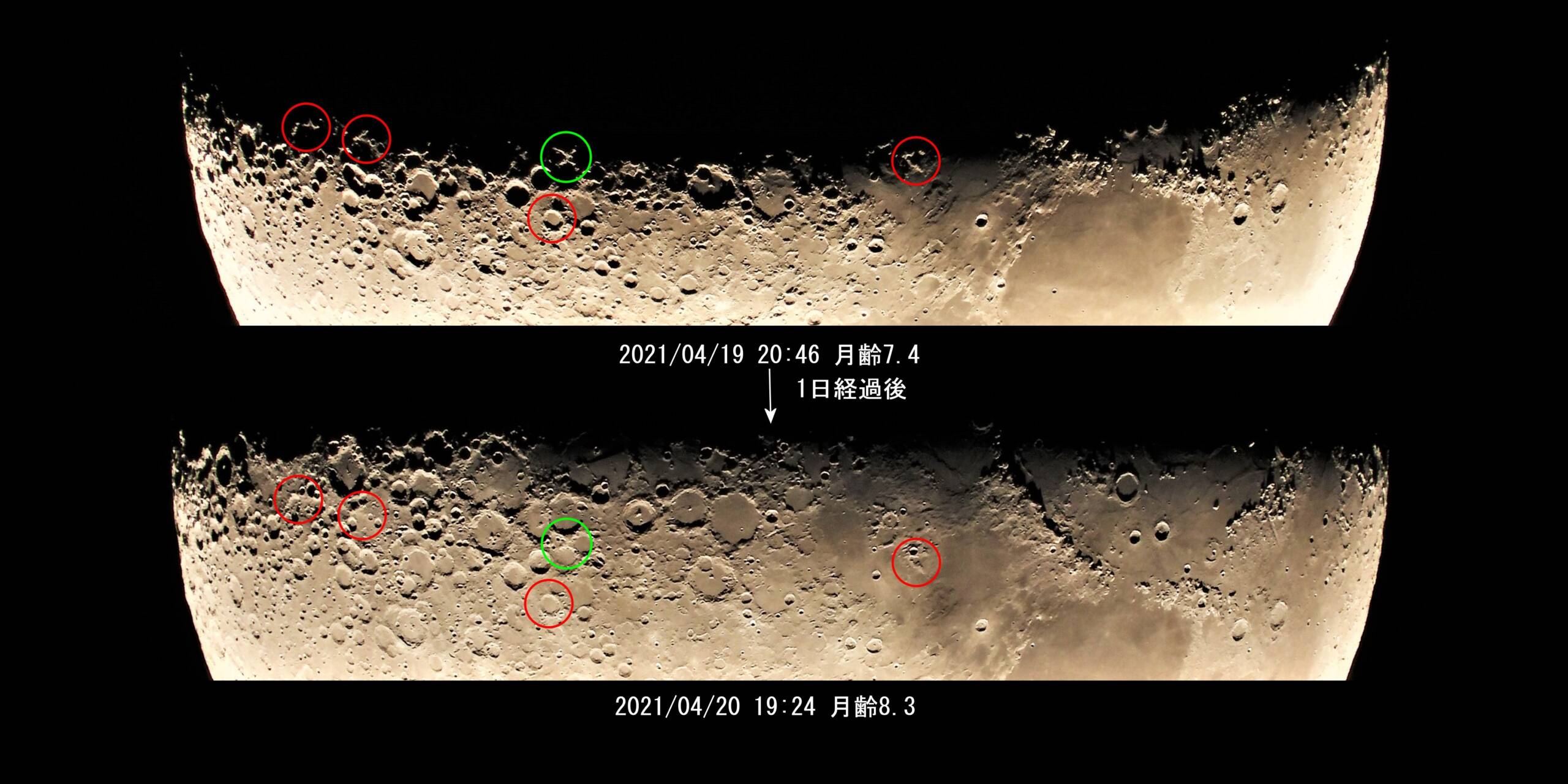 赤丸は「LOVE」(Eは逆)、緑色の丸は「X」です。丸印で囲っているため容易に見つけられると思われるかも知れませんが、月齢8.3では間違い探しのように上下の写真を何回も見比べて一苦労でした。だいぶ月の地形なるものをたっぷりと、わかると達成感が味わえました。
