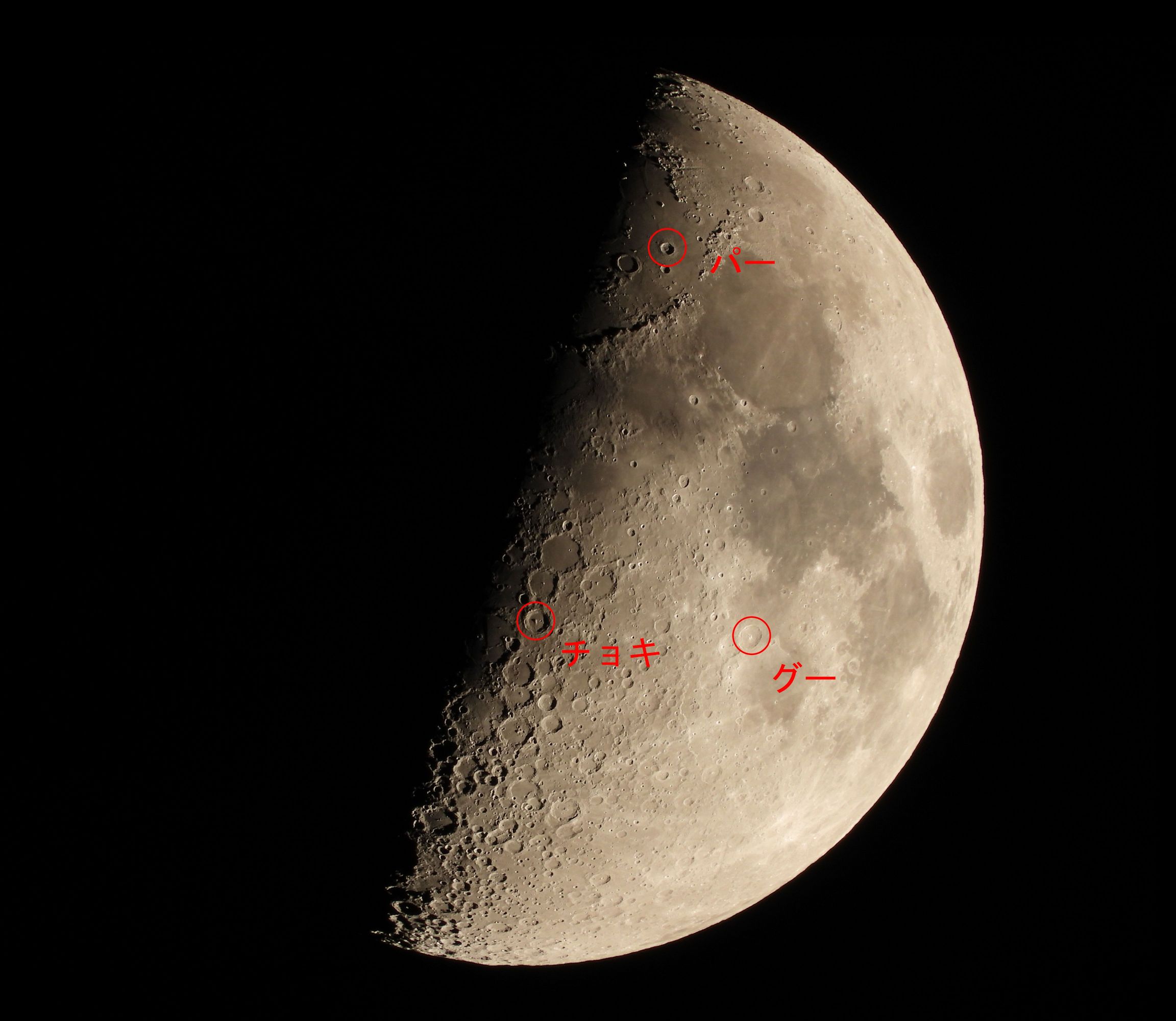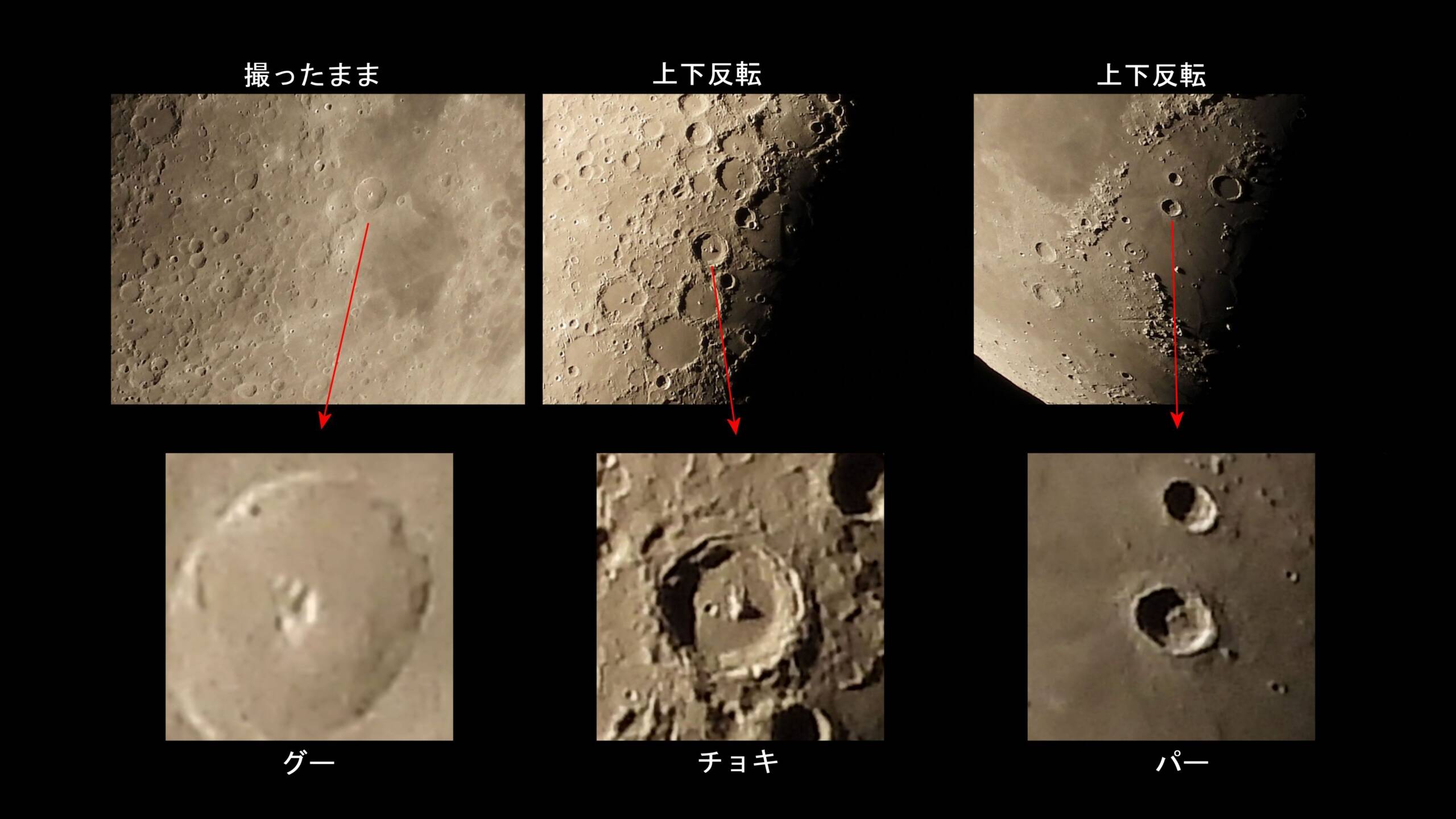 月面グーの情報はネット検索でたくさんありましたが、チョキとパーの情報がほとんどありません。グーがあるのだからチョキとパーは探し出されているものと思っていました。検索で引っかかるのはKen.Nakayamaさんのブログ程度でした。グーだけでは「最初はグー」とだけで終わってしまいますので、じゃんけんにならず気分が良くありません、チョキとパーを撮ってみようと。COOLPIX P1000の解像度では無理かと思われましたが、拡大して眺めていると、チョキとパーは写真を逆さまにしたら何となくそれらしく見えるようになりました。グーも昨日の写真よりも今日の方がそれらしく見えますけれど、やはり左手のように見えてしまいます、チョキとパーは撮影した写真を180°回転して拡大したところ、中央の写真ではチョキがそれらしく、右側の写真では最初パーが見えないと思いましたが、じっくりと眺めている間に、影のないクレータ右半分全体がパーのように見えだしました、念力か。このパーは右の手のひらの5本指、親指がもう少し隙間があれば完全なパーに見えます。このグー、チョキ、パーの写真はCOOLPIX P1000の撮影練習にちょうど良いかも知れません。