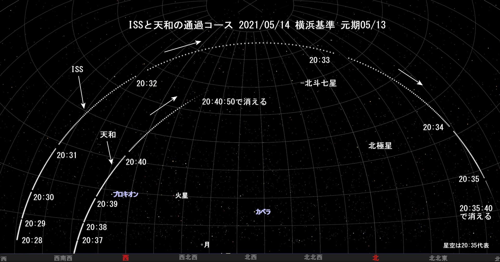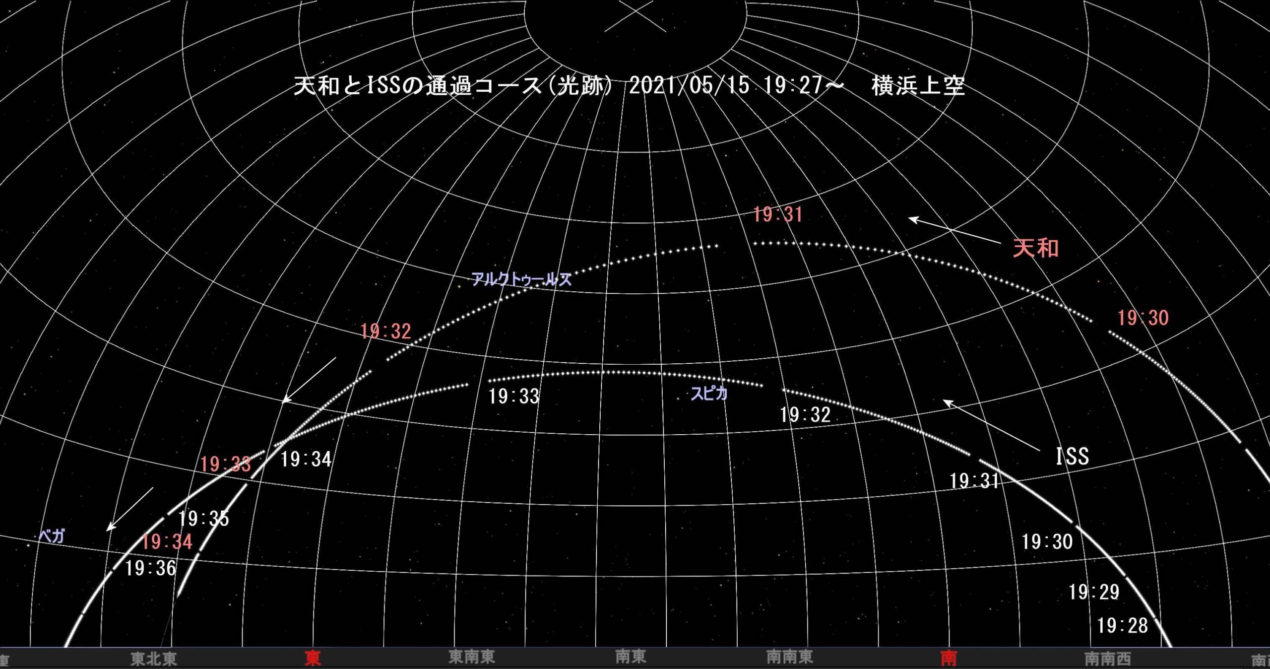 (Rev.2 更新 2021/05/14) 最新の通過コースを確認しました。2021/05/14および05/15の二日分、横浜基準です。ISSの通過情報はHeavens-Aboveもステラナビゲータ11も一致しているように思われますが、天和は少し差が現れています。以下はステラナビゲータ11とHeavens-Above(高度40°以上のみで夕方周回モードに注目)による最新確認情報です。同じ元期日でも採用時刻に差があるようです。最新情報で確認を要します。今日も夕方に確認しようと思います。