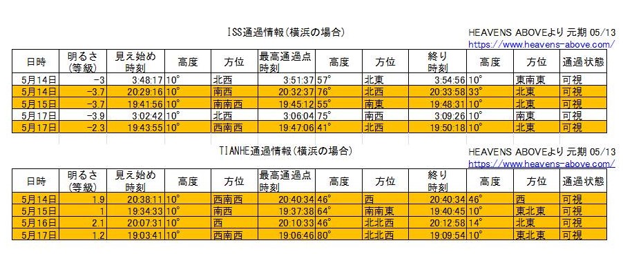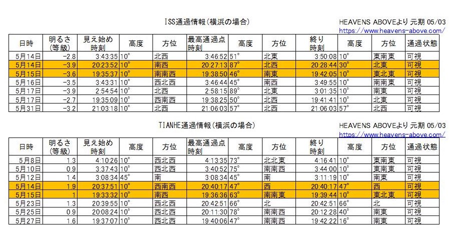 参考に今後の5月中のHeavens-Aboveで予想された横浜上空での撮影チャンス日を以下に示します。ISSは高度40°以上の場合、天和の場合は光度が1等級台までの明るさのみピックアップしています。上記ステラナビゲータ11の元期もHeavens-Aboveと同様に05/03です。