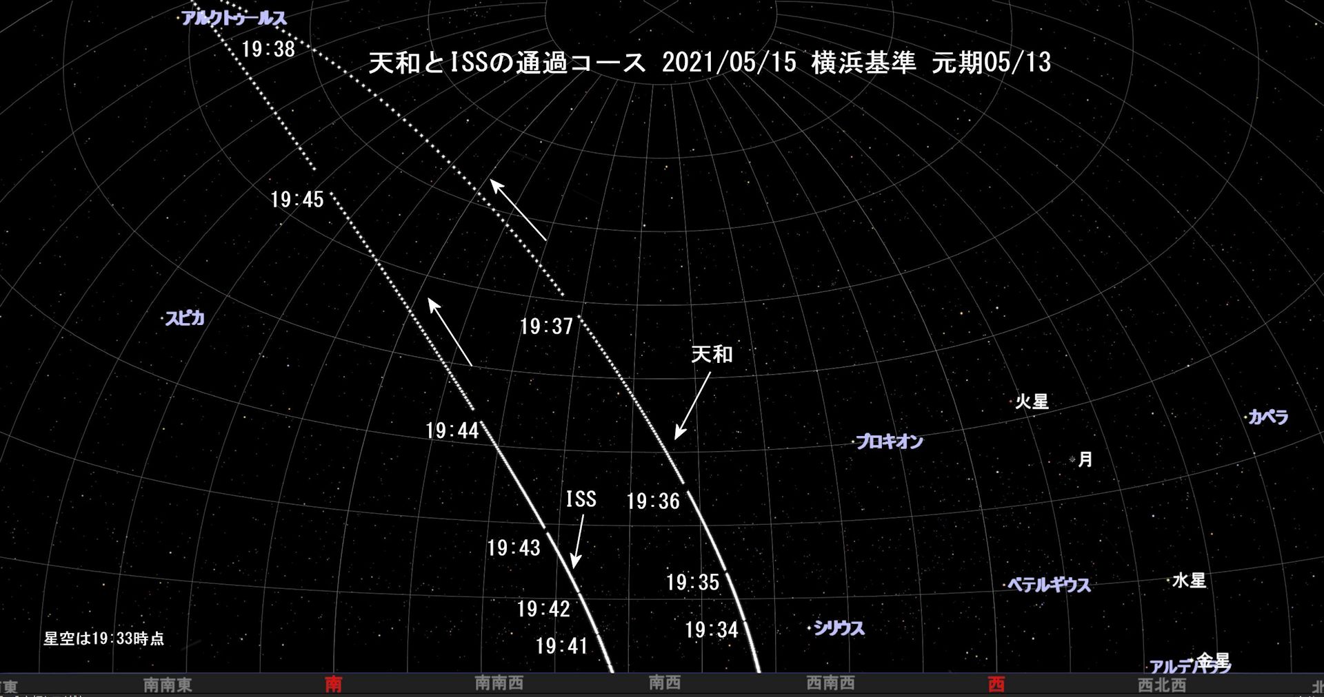 ステラナビゲータ11によるアニメを以下に示します。19:27(右から現れる)~19:37(左に消える)の10分間を高速再生した場合の通過コースです。(横浜上空の場合です)