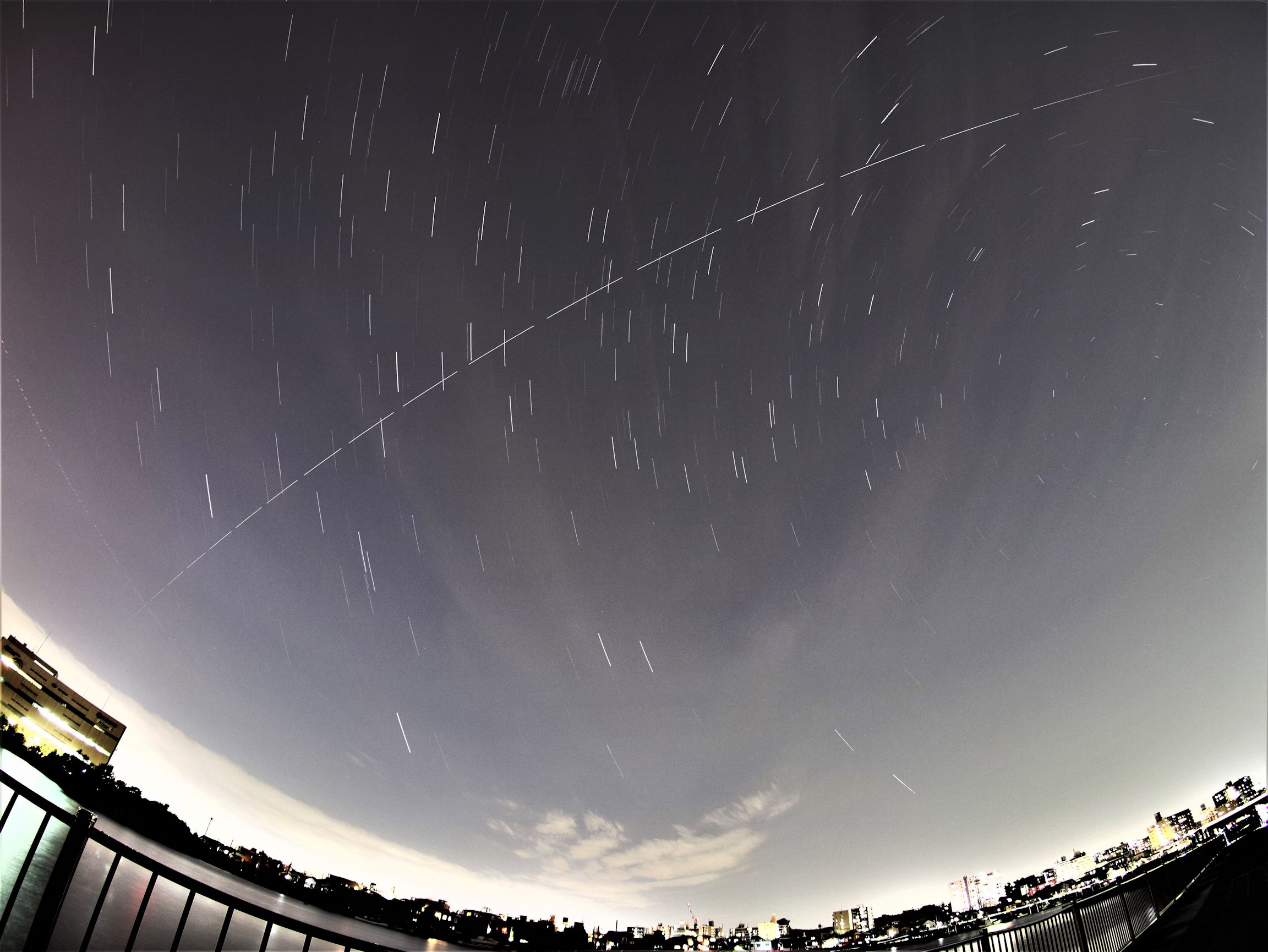 2021/05/14 20:28~20:45の15分以上の自動リモコン連続撮影。EOS M6 7.5mm魚眼レンズ F4 ISO-400 10秒露光2秒間隔繰り返し。連続して撮影にしたのは20:38頃同じ方向から登場する天和を撮りたかったためです。しかし、目視では全く見えず、写真も強烈なあぶり出し処理をしても何も現れずでした。1.9等級との予想でしたが、雲に隠されたのか、残念でした。また挑戦。以下は87枚の比較明処理。