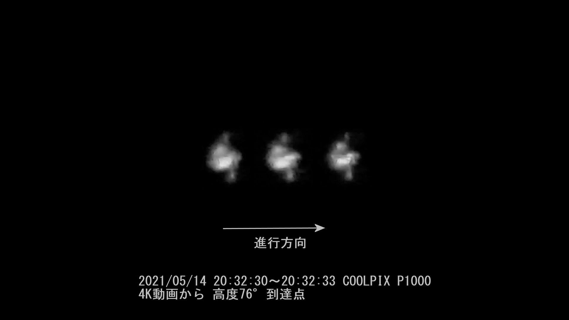 4K動画から取り出した最高高度時点(76°)のISSです。ボーっとしていて、くっきりしない。3枚のフレームを2倍に拡大してみました。薄い雲のためか、ピントがあまかったのか、いまひとつ。ソーラーパネルは見えずでしたが、右端先頭部分はなんとなくそれらしい形。