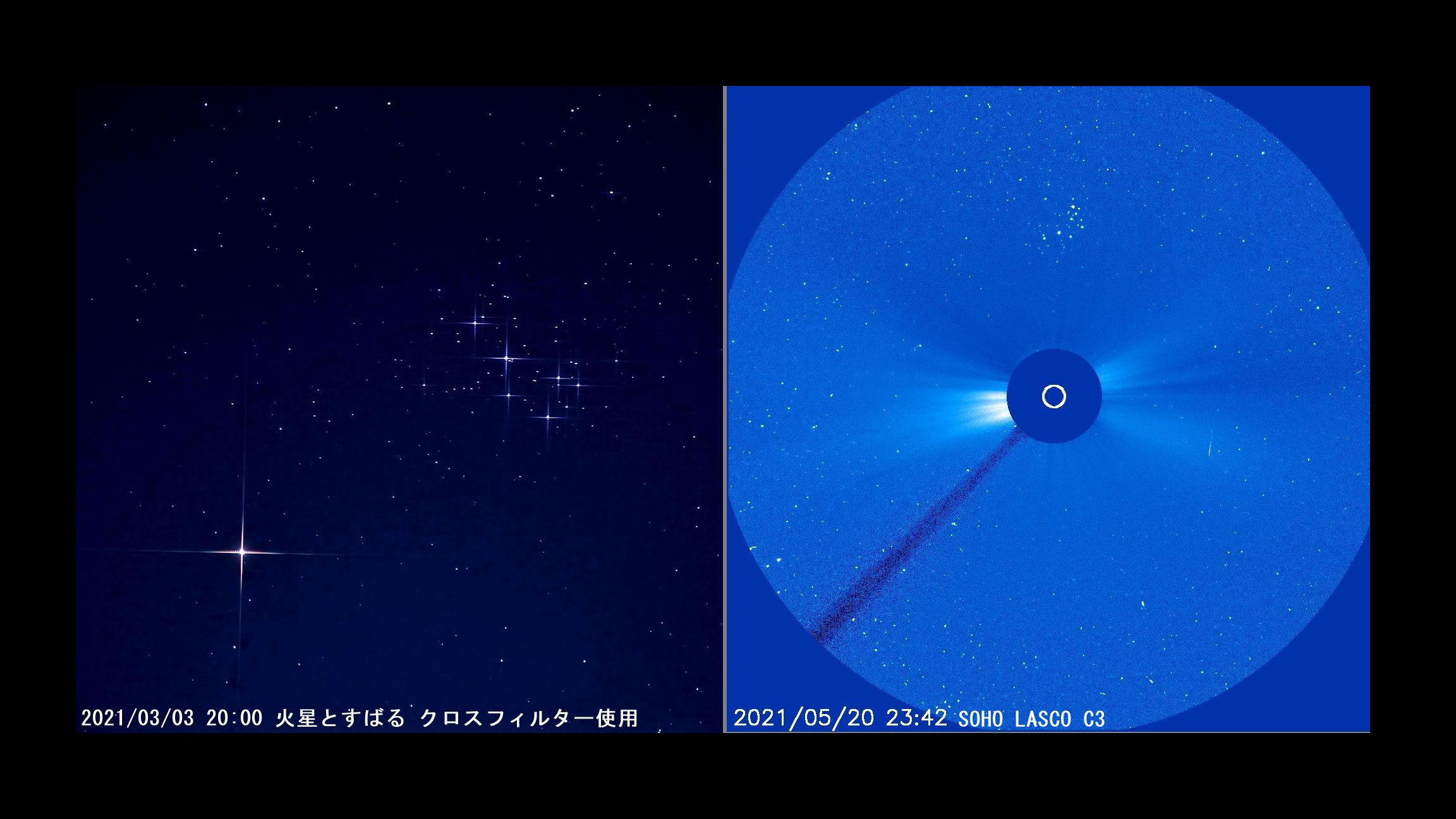 太陽観測衛星SOHO LASCO C3にプレアデス星団が太陽の後ろに。一週間経てば右に離れ見えなくなると思います。二か月前の夜空に火星と並んだ時の写真と一緒に。また来年の今頃にでも太陽の後ろで再会。