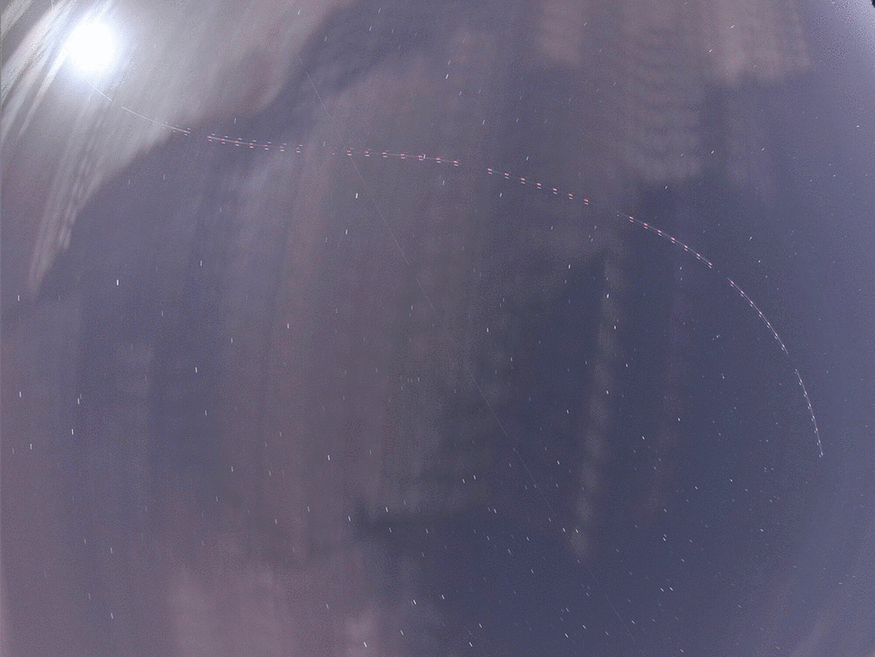 EOS-M6 7.5mm ISO-400 F5.6 10秒露光+2秒間隔の繰り返し撮影。少し天和が目立たないので画像処理し2枚を交互に表示するGIFアニメにしました。12枚の比較明写真です。右側が北、時計回りに下が西、左側が南、上が東です、天頂は中央。中央右側に北斗七星が写っています左コーナーは月。飛行機と雲が邪魔していますけれど、中央付近右下から左上(写野外の直前で地球の影に入り即消えました)に天和が通過する様子が直線状に写っています。No.886に続いて2回目の撮影。
