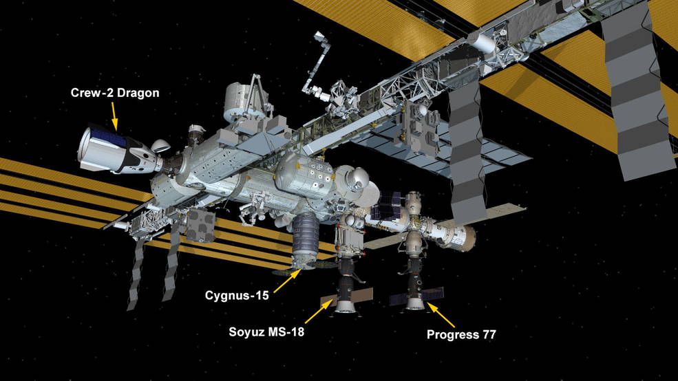 撮影当日のISSの姿はNASAに公開されています。その画像と比べてみると、望遠鏡の画像ではCrew2 Dragon、プログレスおよびラジエータの折り目も写っています。以前にも書きましたが、望遠鏡による写真はこの程度の大きさが好みです。あまり大きいと宇宙ステーションというよりはただの建造物のようで(構造物には違いないか、自分の器具の負惜しみですので)、しかももっと解像度の高い大きな写真はNASA等にあります。