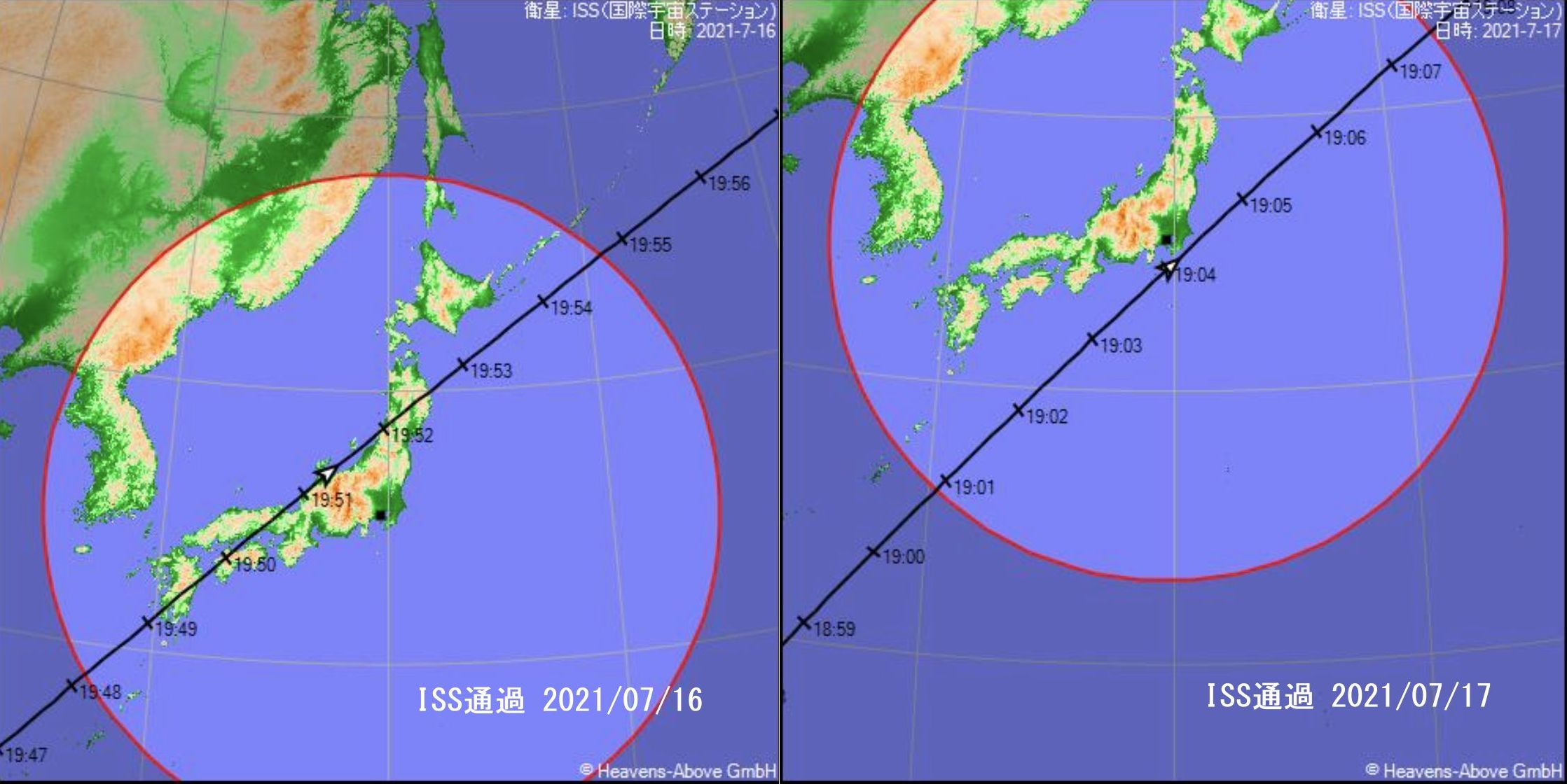 昨日に続き、今日の夕空も晴れそう。ちょうどISSが巡ってきますので復活撮影をと思います。横浜上空基準です。明日も晴れると良いのですけれど。ステラナビゲータ11による07/16と07/17のISS通過コースです。Heavens-Aboveの地上軌跡も載せておきます。とても楽しみ。