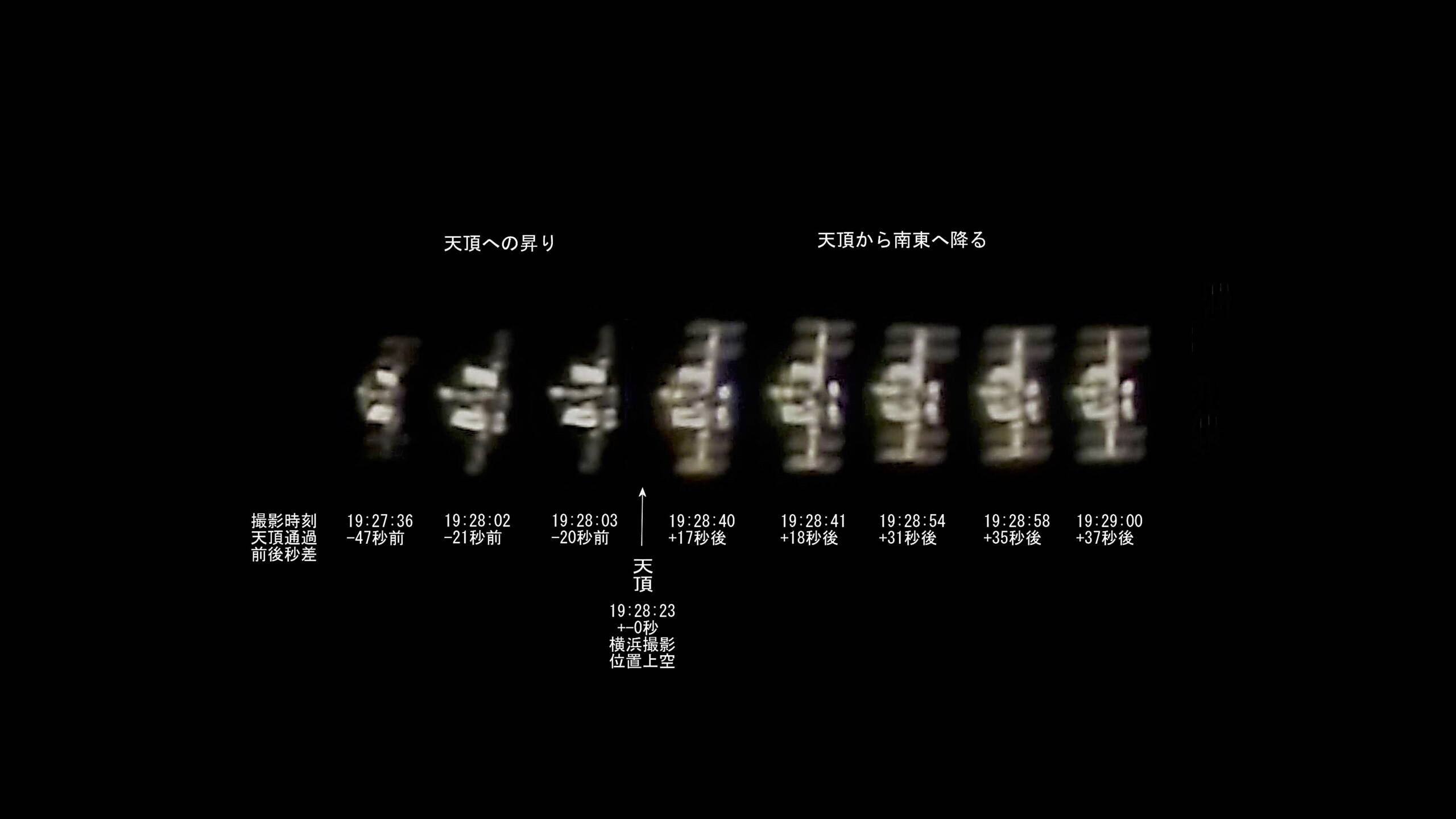 進行方向は右側です。天頂到達を境にして太陽光の反射からソーラーパネルが見え始めています。先頭の「きぼう」、ラジエーター、トラスは見えていますがそれ以外は良くわかりません。しかし、左から右へ全写真を流し見るとNaukaが見えているようにも思えますが、どうでしょう。天頂付近では真下から見ていることになりますが、その前後は斜め下から見た画像になります。iROSAは解像していませんが写真下側の中央部分がやや明るくなっている部分がそうかもしれません。