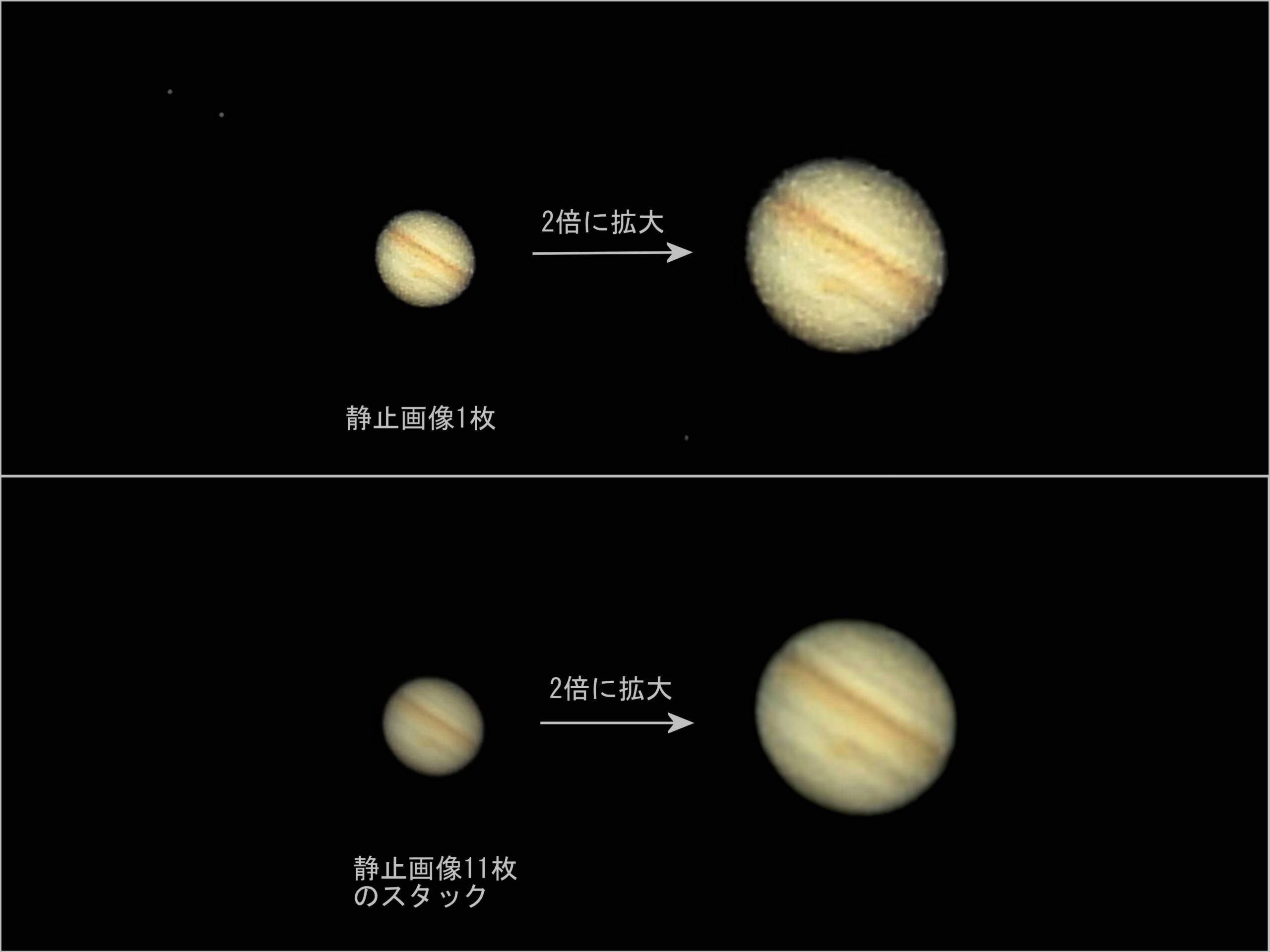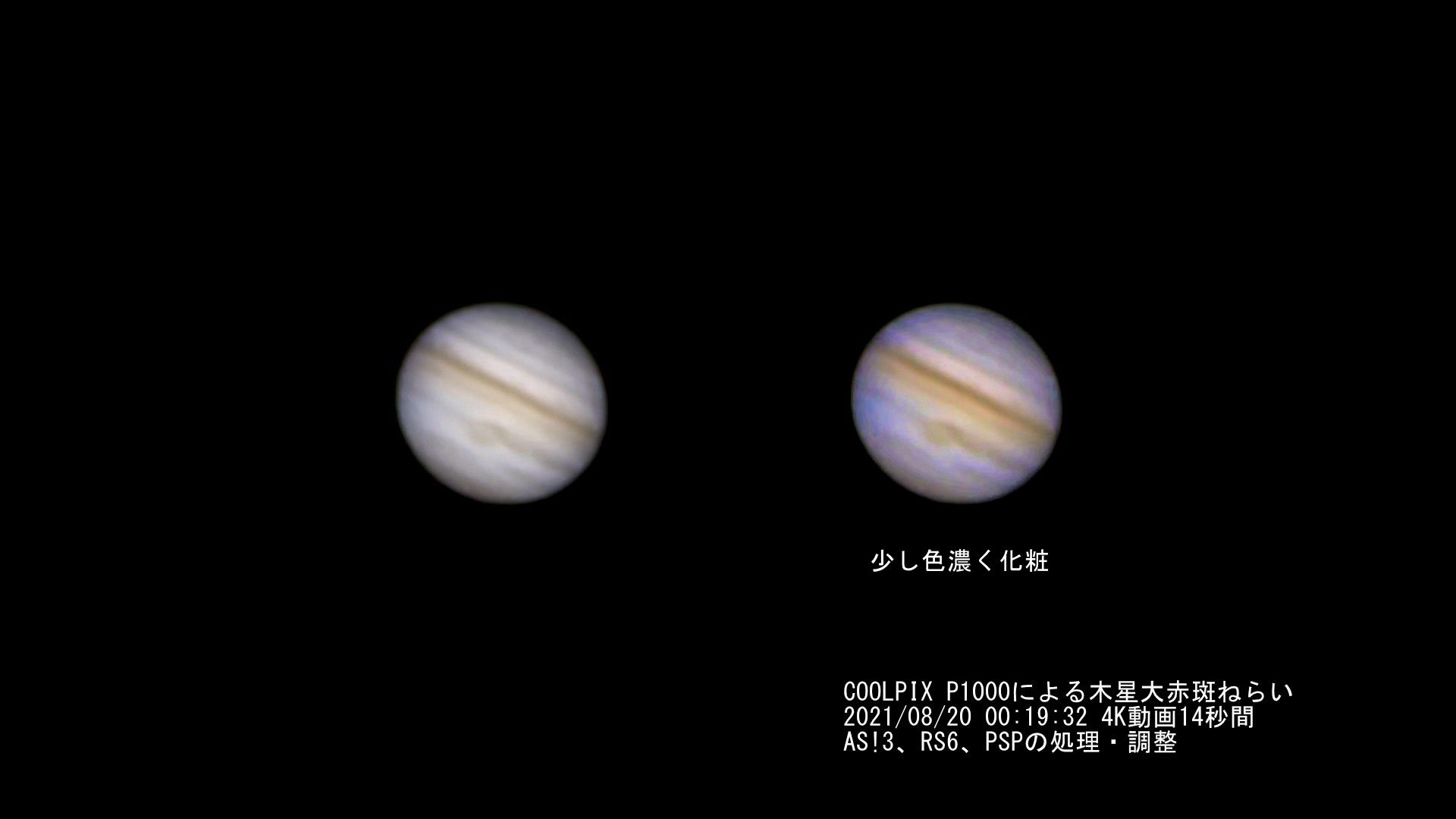 2021/08/20 00:26:39~00:27:04 ISO-100 539mm×4.0(フル換算3,000mm×4.0) f/8 1/50s 11枚連続シャッター。その中からベストな写り1枚と11枚全体のスタック画像を並べて示します。望遠鏡ではないので一枚で大赤斑の写り具合を示すのは難しい、スタックすると粗さも消えてそれらしく、シーイングを考慮すればまあまあです。動画スタックの方がボケ調でも良さそうです。