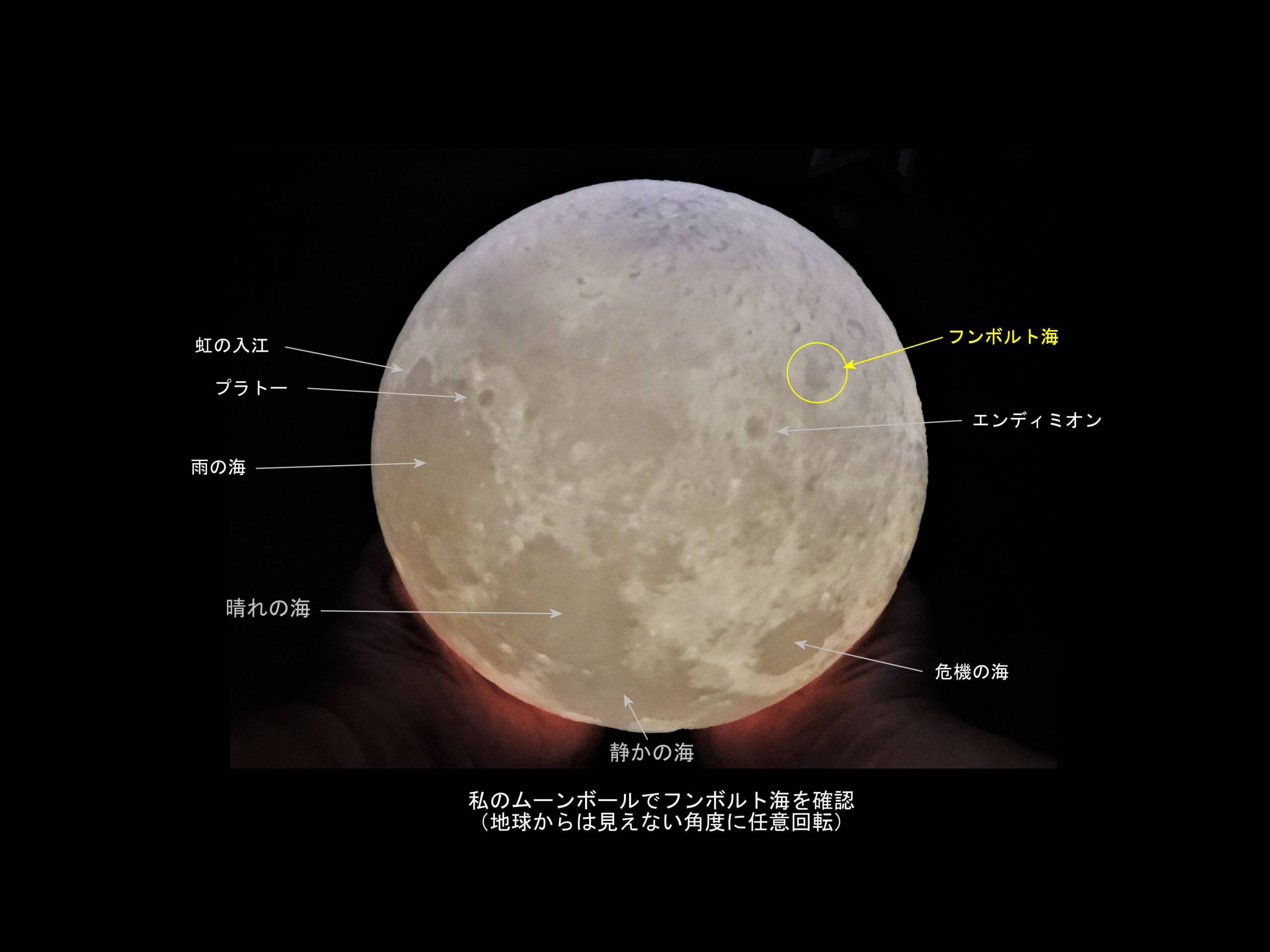 いろいろ写真例等を調べて、個人的に理解を進めるため、数年前にプレゼントしてもらったムーンボールを両手に持って、フンボルト海の位置を確認しました。たぶん、この位置だと思いますが、立体で見るのと写真で見るとでは印象が全く異なりました。当然のこと、月齢10.9の写真では月の外側なのでほぼ接線方向の状態で見ていることになるのでかなり扁平したように写っています。ムーンボールでは地球からは見えない角度、月の裏側の部分も見えますので、立体感を感じながら広い面積の海として見られます。