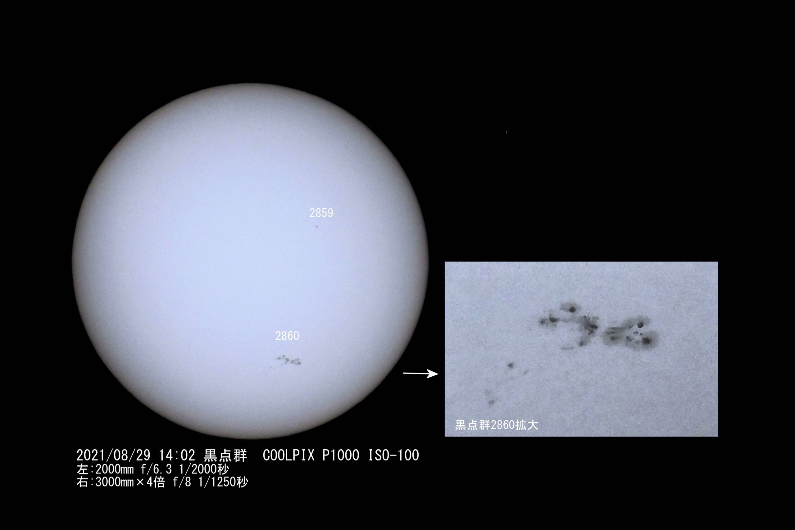 SOHO/SDOでも数日前から黒点群2860が広がったように見えましたので減光フィルターで撮影。可視光線観察だけでも黒点が見えれば変化がうかがえて面白い。午前中は曇りでしたが午後一時的に太陽が現れました。部屋から撮影なので風の影響で振動もない。しかし、ごく薄い雲が時々太陽面を横切っているのがモニターでもわかりました。夜は木星の大赤斑がこちらに向くので二回目のクリア撮影に挑戦したかったのですが曇り、残念。 太陽の撮影条件は写真内に書き込みました。明るさとコントラストは調整しています。2859は見えましたが、2861および2862は何も見えませんでした。