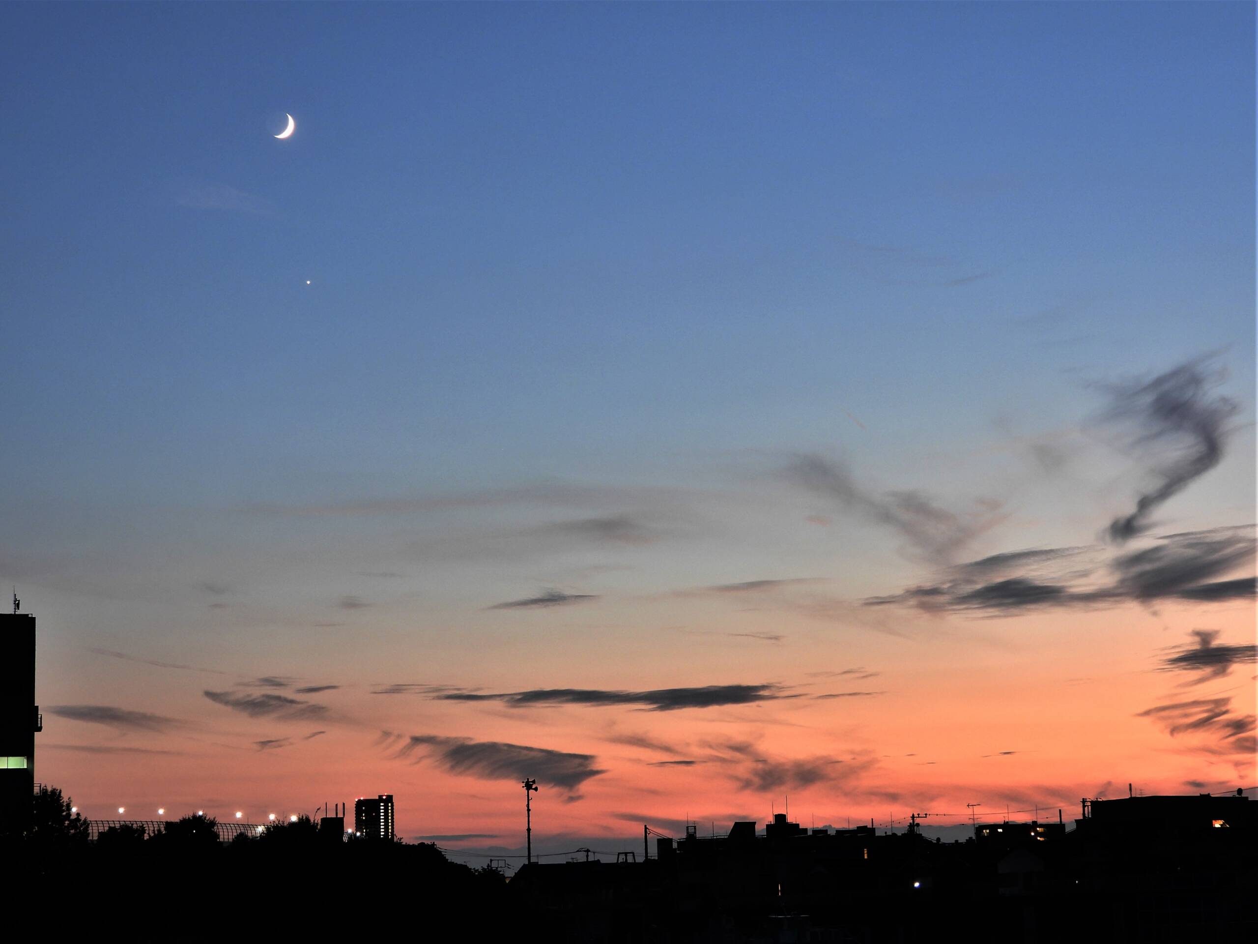 2021/09/10は月と金星が接近、夕焼けが残る夕方18:23(現地日没は17:57)の街並みに輝く月と金星です。