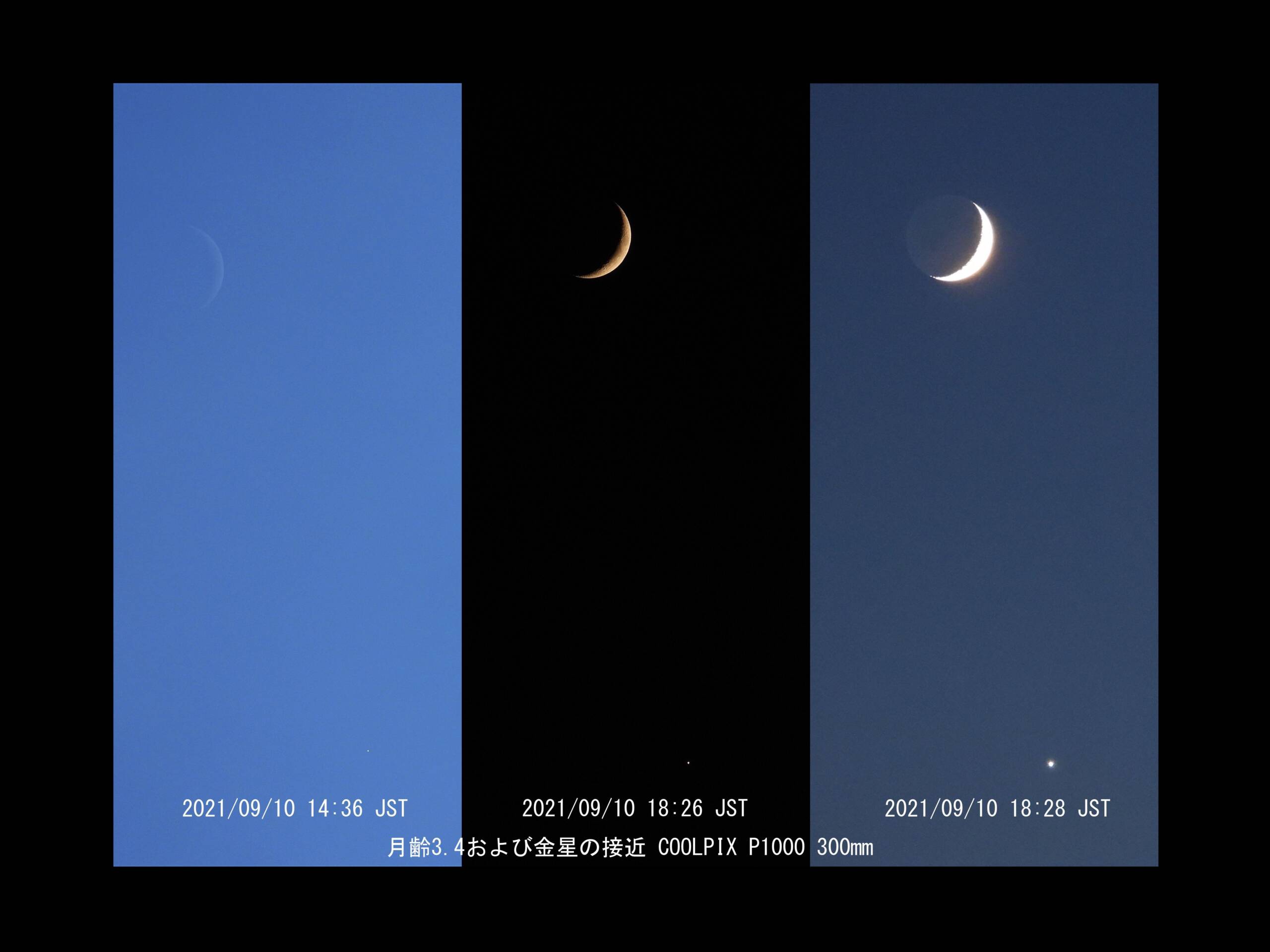 昼間も晴れて、部屋から月が見えましたので明るい空の月と金星です。月も薄い写真ですけれど金星は何とか見えます。一昨日、眼科で定期健診したばかりで異常はないのですが(関係ないですけれど)肉眼では金星が見つけられなかったな。双眼で見るのも良いけれど、モニターでは見えましたので。夕方の写真と並べて一枚に。焦点距離300mm相当の撮影です。夕方にはもう見かけ上金星(月の方)が離れているような感じ。