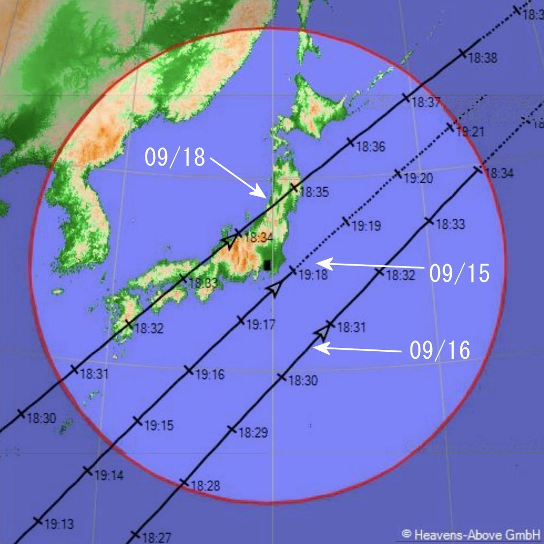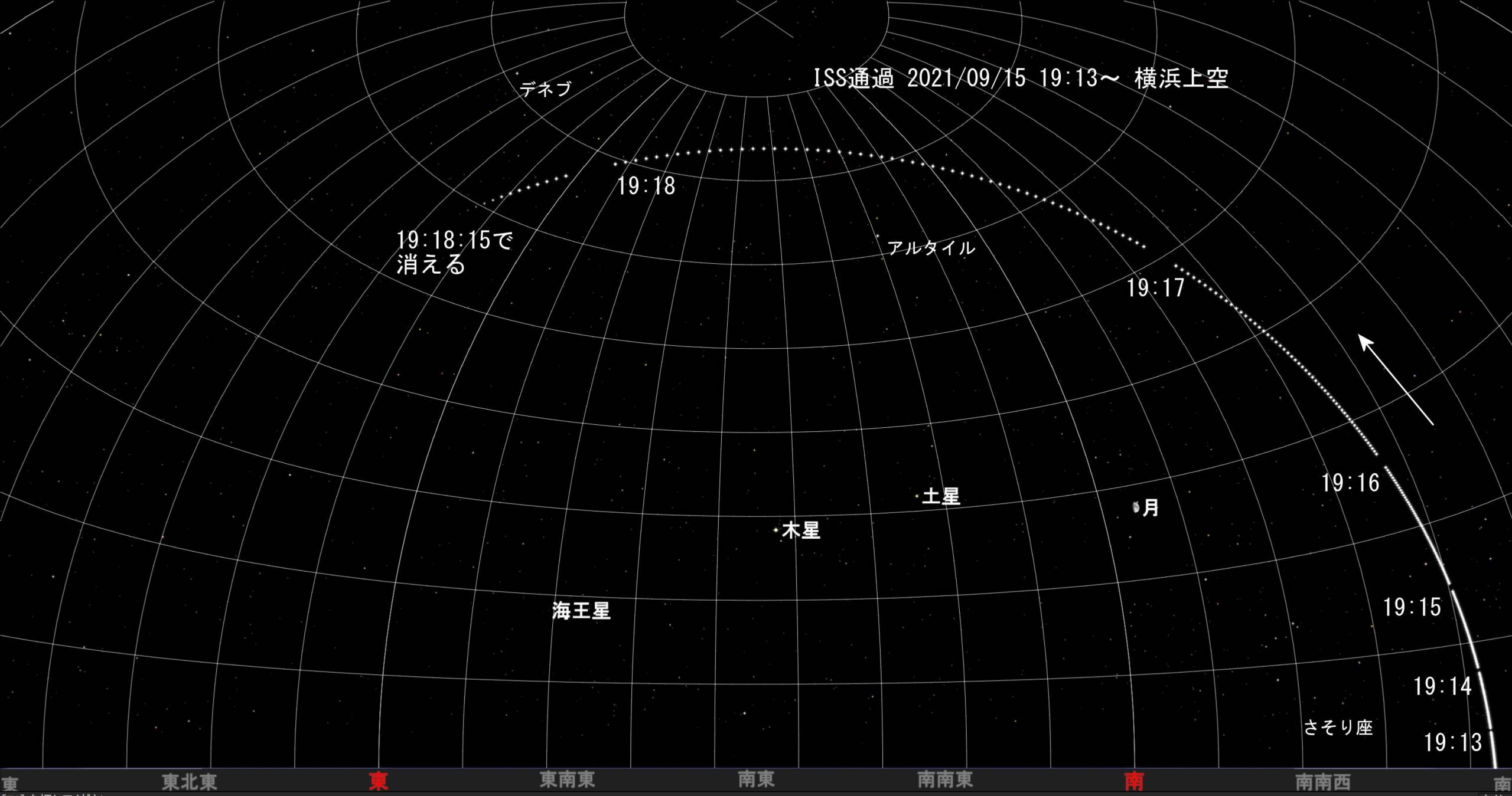 Rev.1 TLEデータ更新(9/12→9/14)で周回情報が少し変わりました。最新版に差し替えます(2021/09/14)。でも雨かぁ。9/18は横浜で金星接近通過ですけれど高度10°で距離は約1,500Km、遠いなぁ。光跡も難しそう。(9/14記)