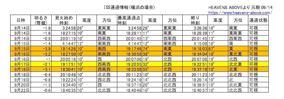 Rev.2 天気予想は晴れっ、になりましたが。さらに軌道データが更新されています(元期9/14)。しかし、下記最新情報と比較して1秒程度のズレです。このため図表は変更しません。ステラナビゲータとHeavens Aboveの情報はここに来て一致しています。ただ、ここ数日間、ブースト修正のためでしょうか頻繁にしかも大きく変化していますので、その後も最新のデータで確認要です。参考に今日の横浜上空になってしまいますが夜空ISS通過コースの図を末尾に添付しておきます。(9/15記)