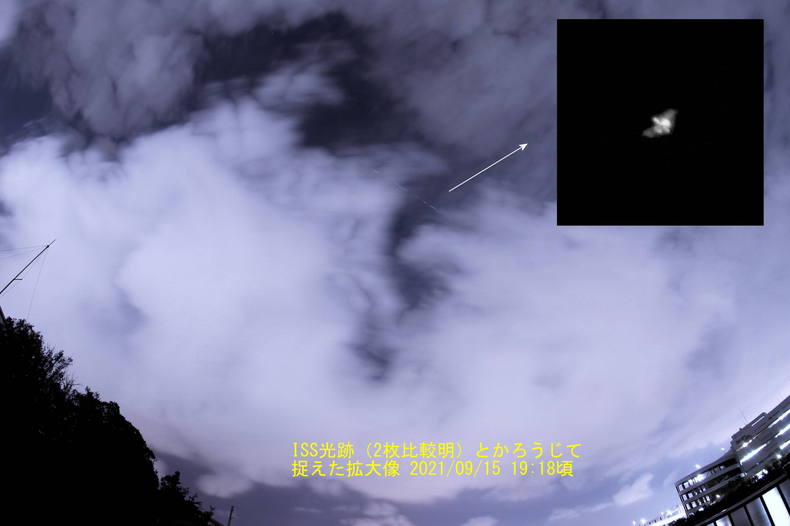 拡大像は最高高度近くに達する直前に数秒間見えた瞬間を4K動画で捉えました。雲を通したひどい写りですがかろうじてISSとわかる程度の1フレームを選んでペーストしました。仕方がない、次のチャンスに。