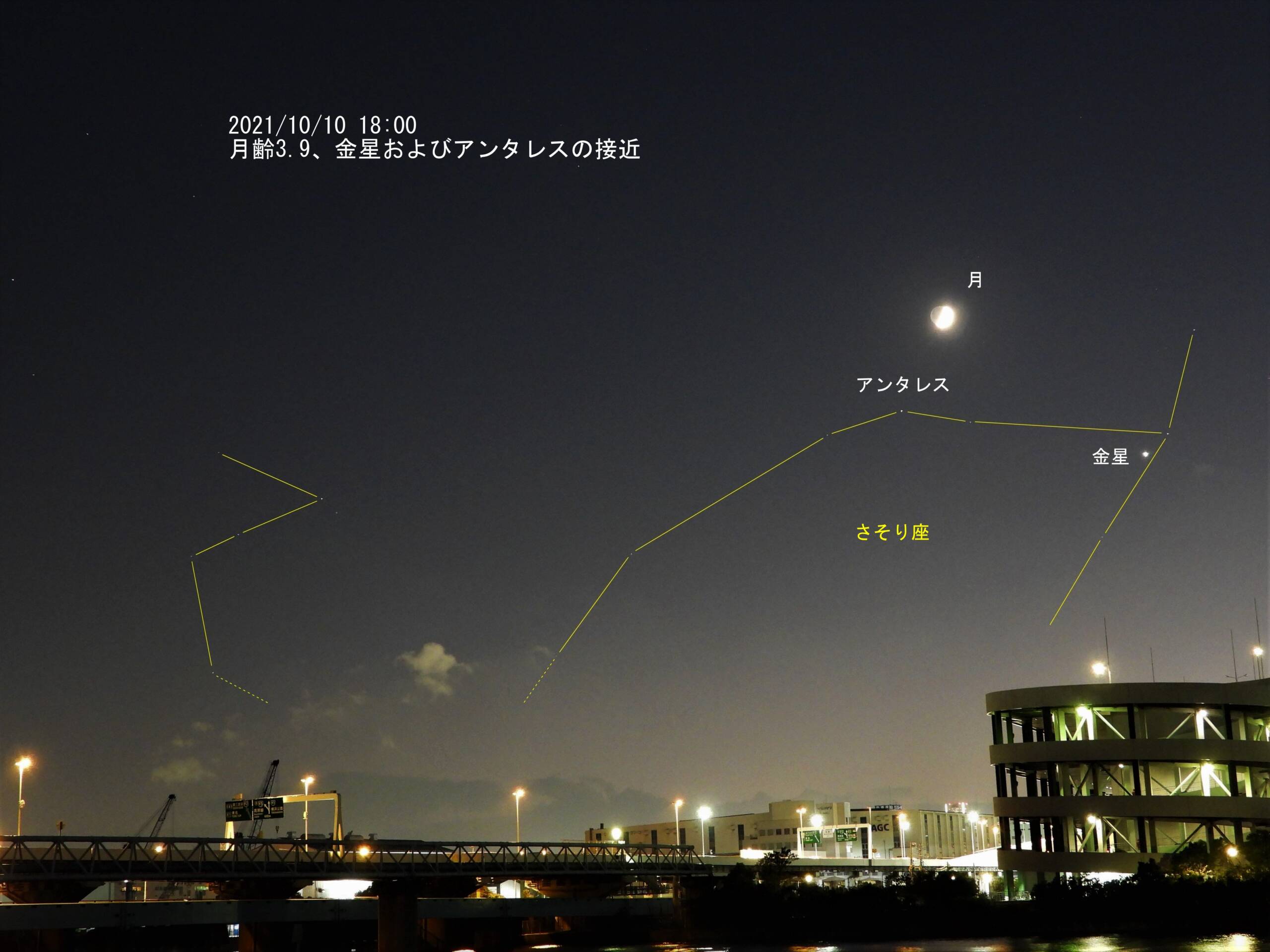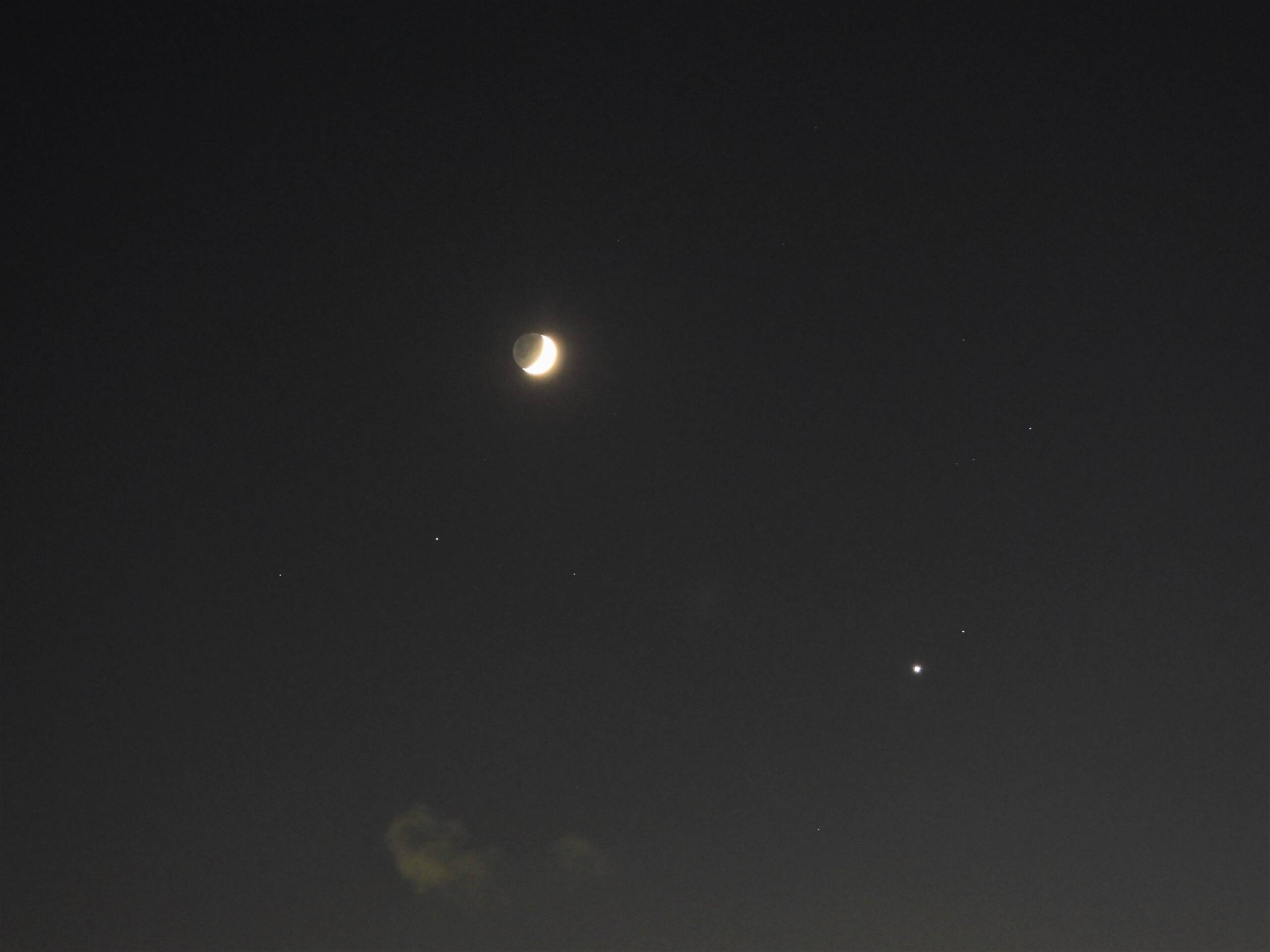 タイトルは「昨日の….」のままにしておきました。月齢3.9、金星およびさそり座のアンタレスが集まりました。目ではアンタレスまでしか見えません。光害地域真っただ中。