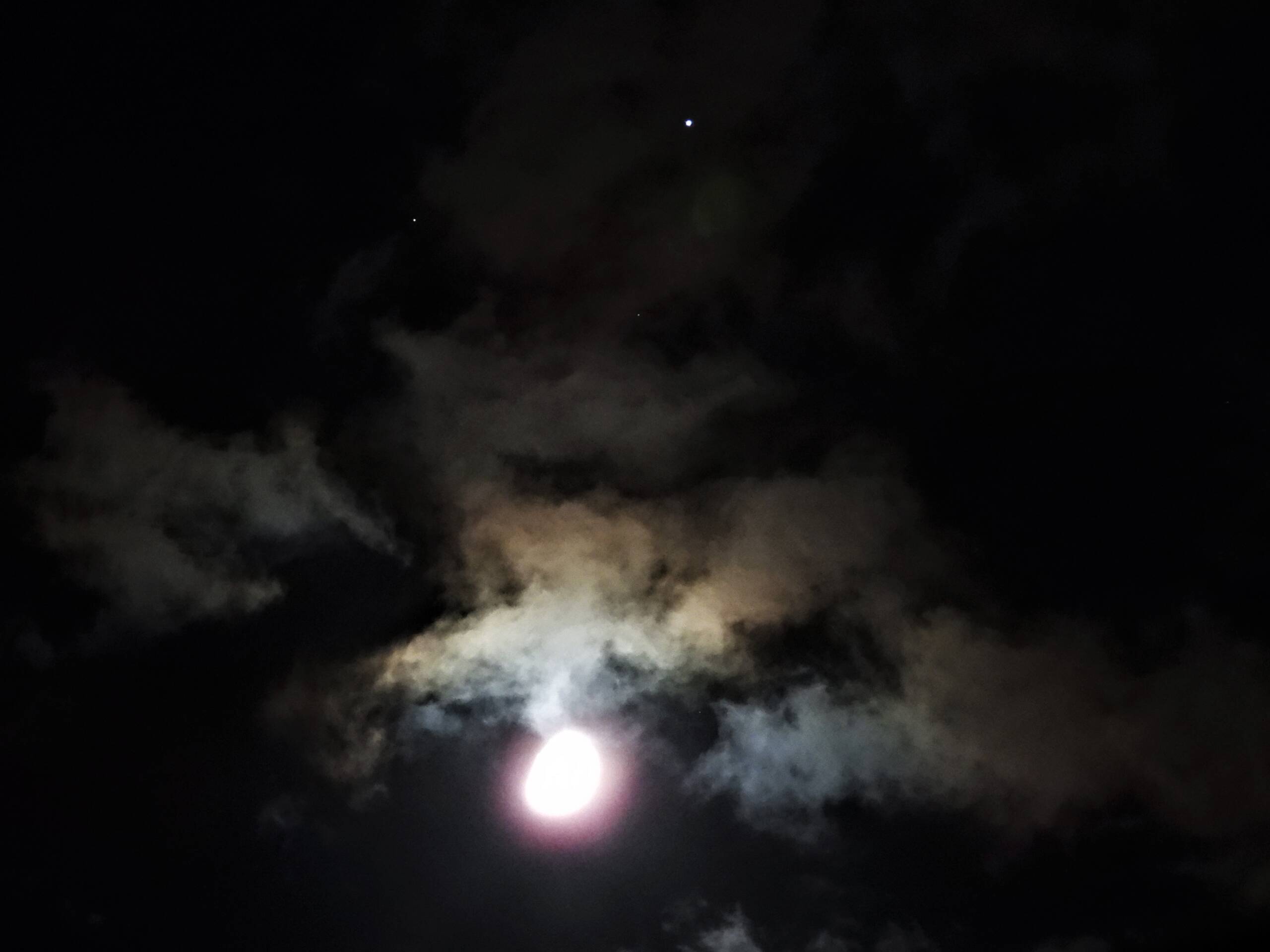 2021/10/15の空は月と木星が近づいて見えるので窓から。雲の流れがひどいが、両方見える時を狙って。