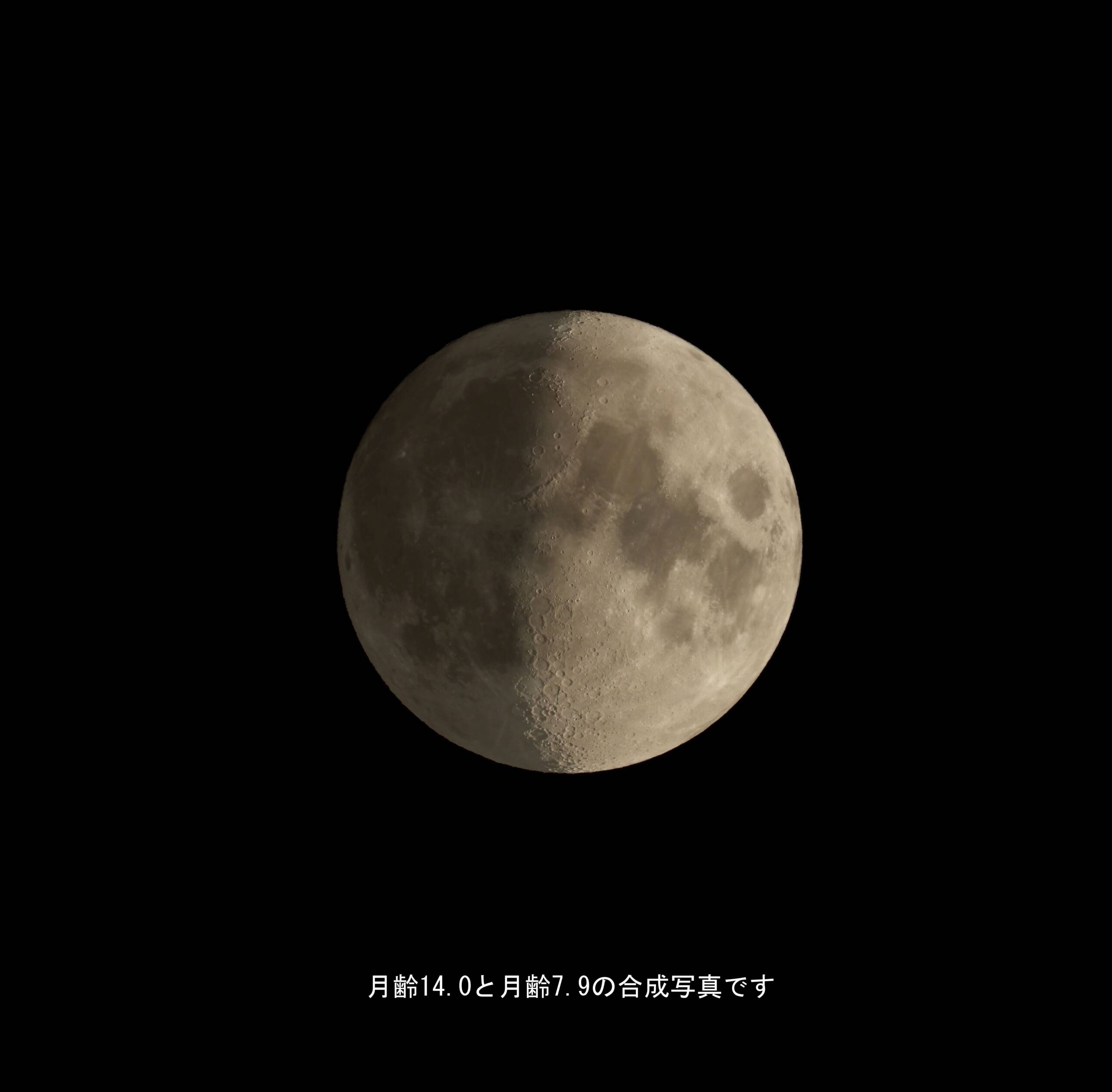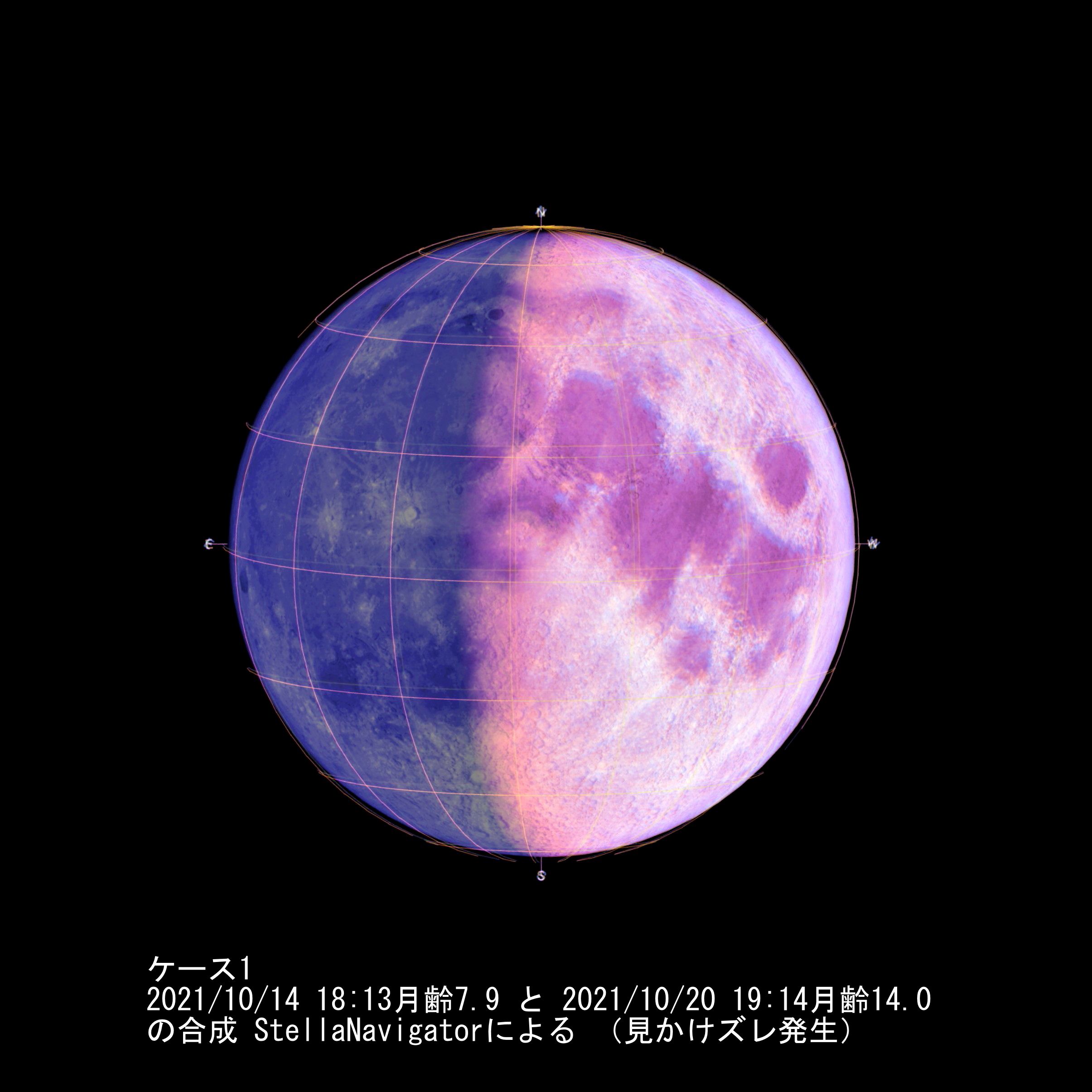 ケース1 半月2021/10/14 18:13 月齢7.9、満月2021/10/20 19:14 月齢14 → 実際に撮影した写真の組み合わせでもあります。