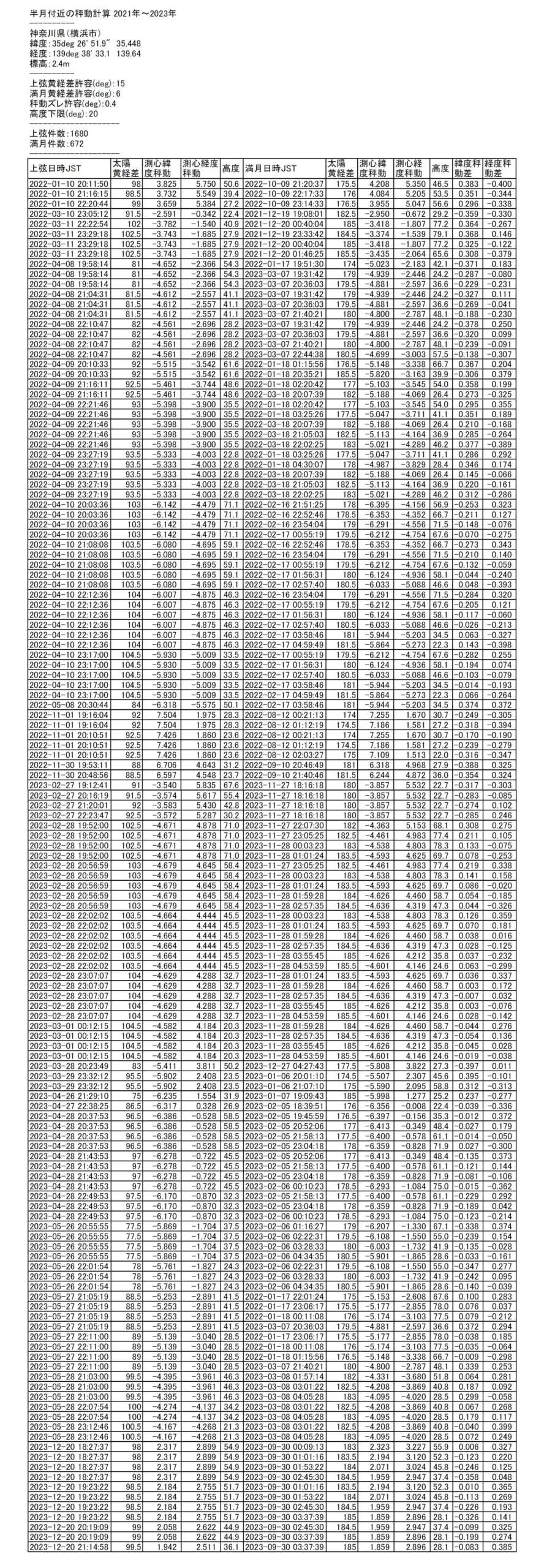 解析結果は上弦の月の日時とその時の測心秤動に近い満月の日時をリストにしたもので記事の最後に載せておきます。月齢の選定は重ね合わせた時に見映えが劣らない範囲は許容しています。測心秤動は個人としての利用になってしまいますが横浜の場合です。それでも結果は近隣県であれば誤差が小さいと思われますので参考にはなると思われます。表形式でしたが本記事中にはJPEGに変換し載せました。