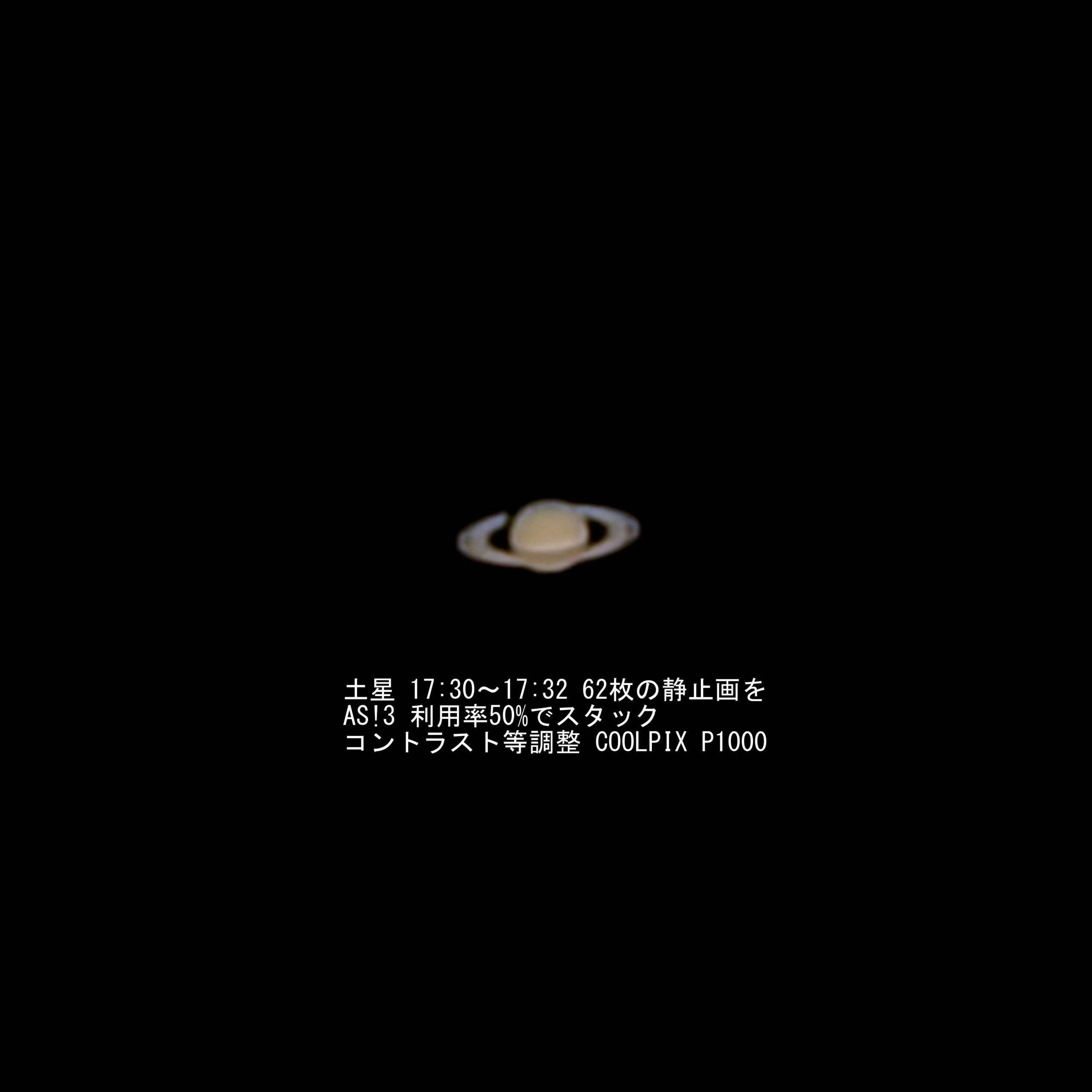 金星を数分で切り上げ、即、土星に。途中、雲に隠されてしまいましたので、4K動画はあとにしようと。しかし、木星の撮影に入ったきり、戻ることはせずその内、西に沈んでしまい静止画のみになってしまいました。モニターで見ていましたが、久しぶりにリングの境界もクリアで撮れていると思いました。スタックにするとその境界がいまひとつ、だからと言って、1枚画像ではかなり粗い画像です。