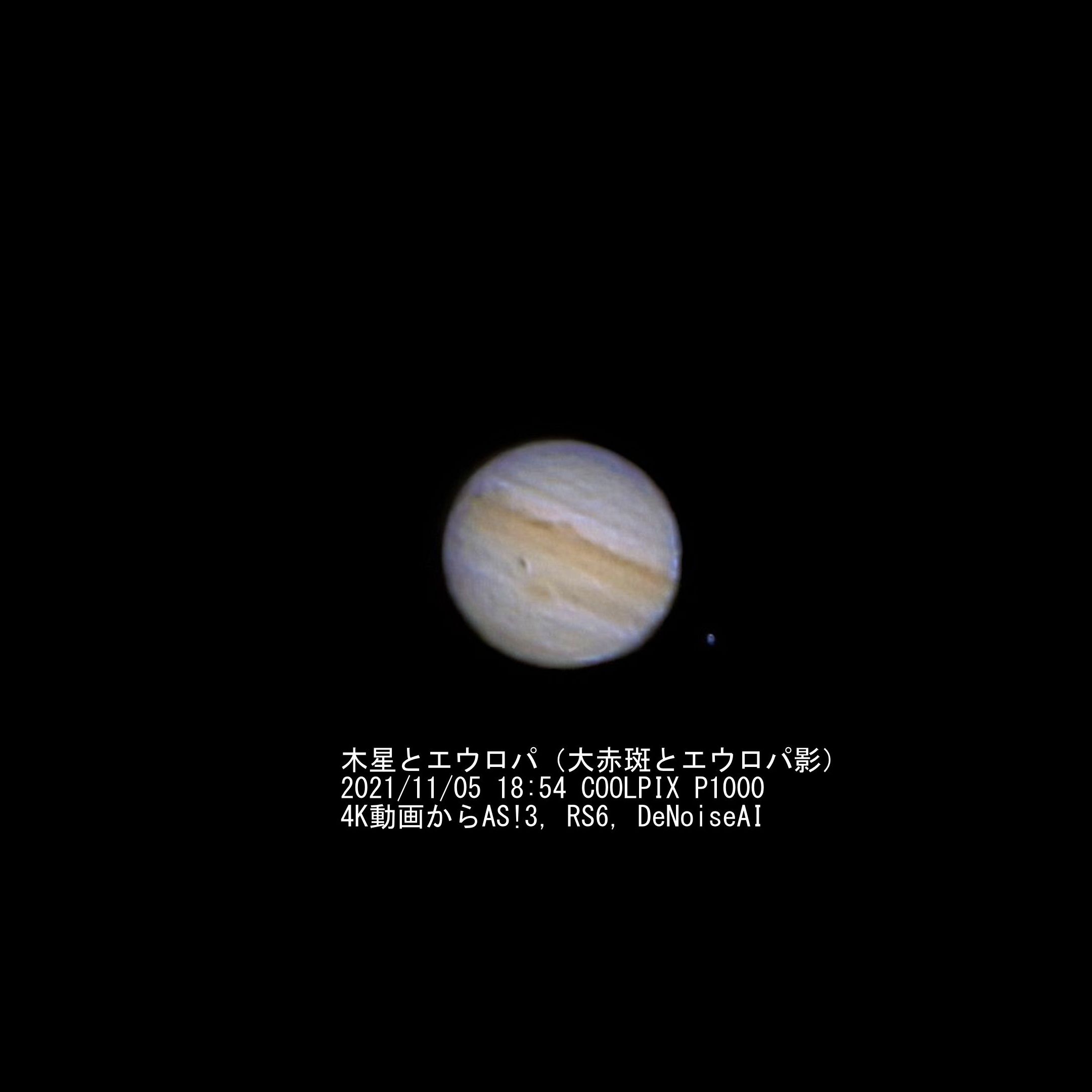 拡大して見ると大赤斑とその左やや上近くにエウロパの影らしきは見えると思います。左側にイオ、右側に木星本体すぐ隣にエウロパ、離れて右下にガニメデが薄っすらと見えています。