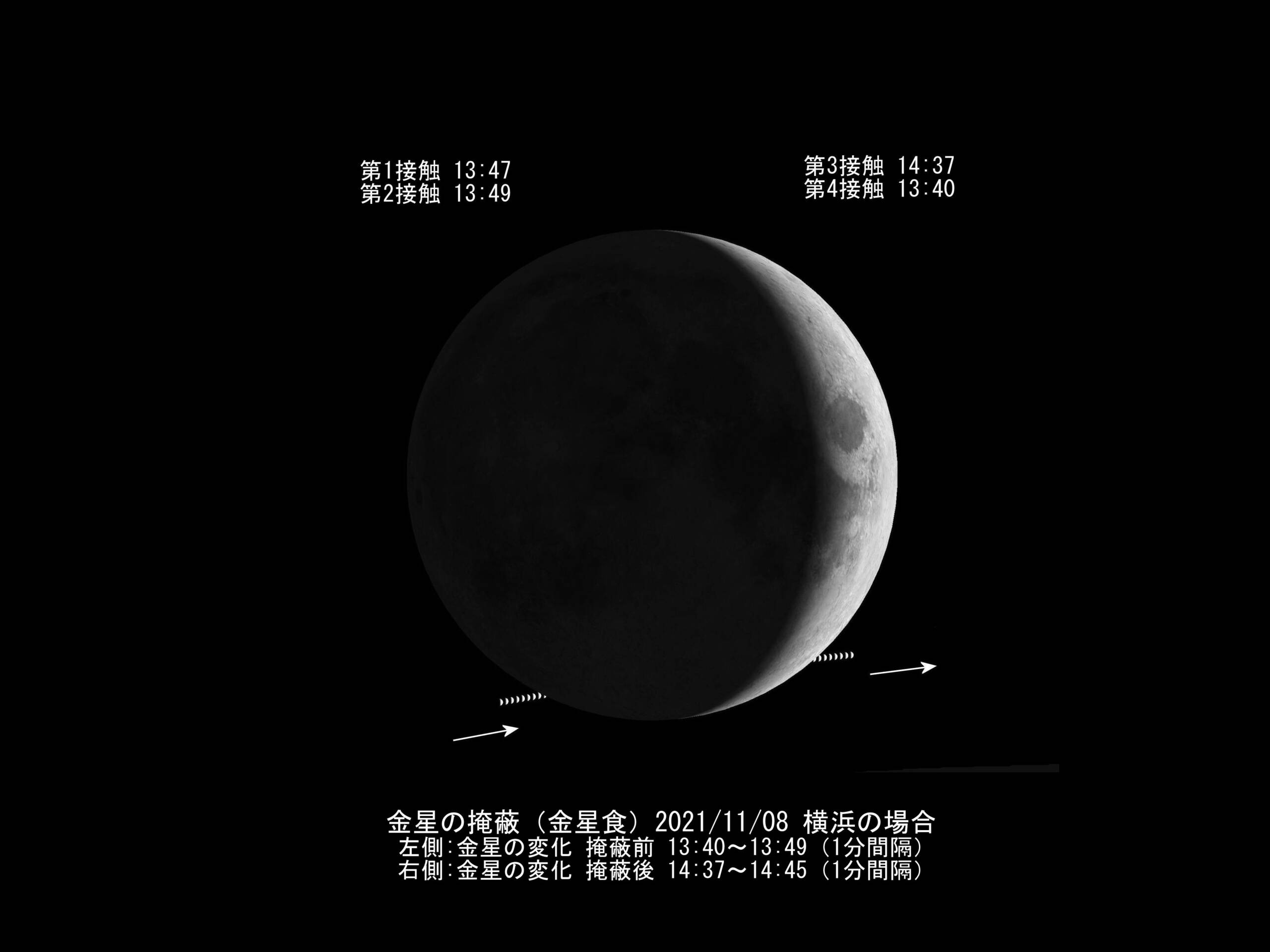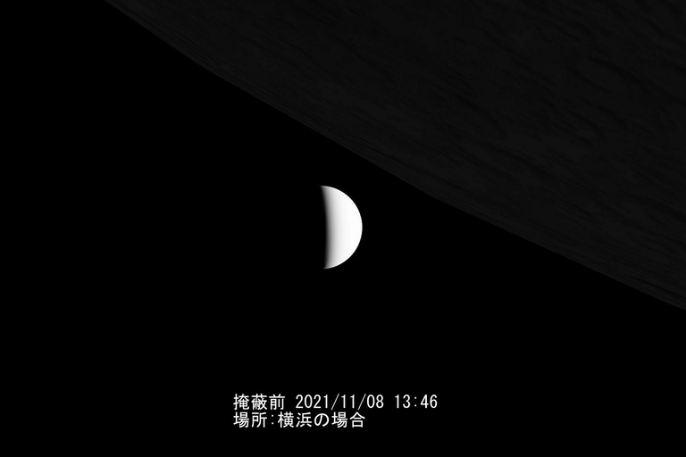 以下は金星の月へ隠れる全体画像および超拡大した時の掩蔽前後のシミュレーションです。横浜ですので個人用になってしまいますが、撮影時の参考データ。晴れるかどうか。これ見てどう撮ろうかと楽しみです。