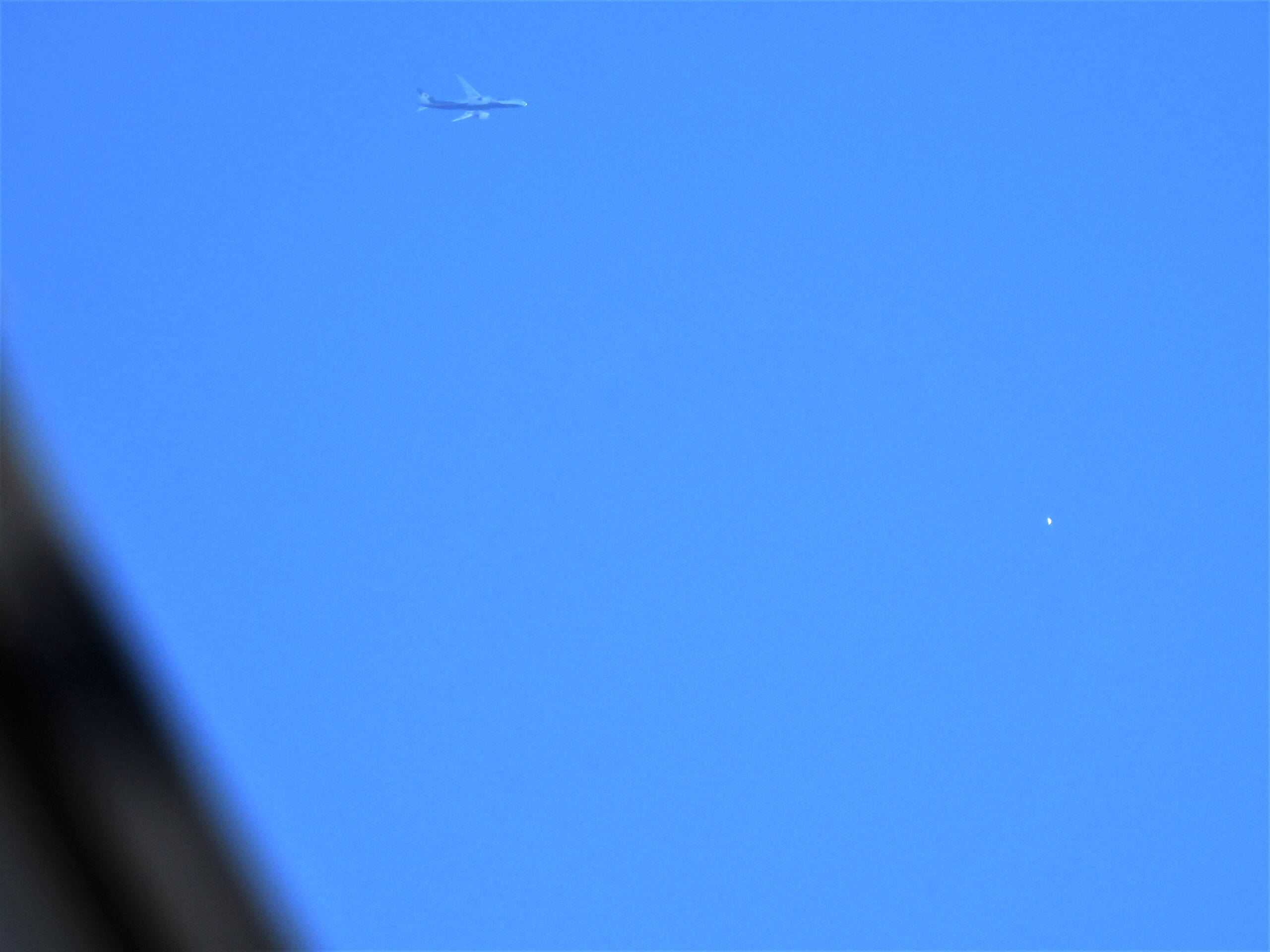 偶然ジェットが通過。焦点距離は1,000mmですから画角はかなり小さいが入りました。右側に金星。近くに電線がありましたのでそれでリード。一度見つけられると以後の捕捉、導入は比較的スムーズにできるようになります。しかし、青い空だけでしたらかなり苦労することは実感しました。