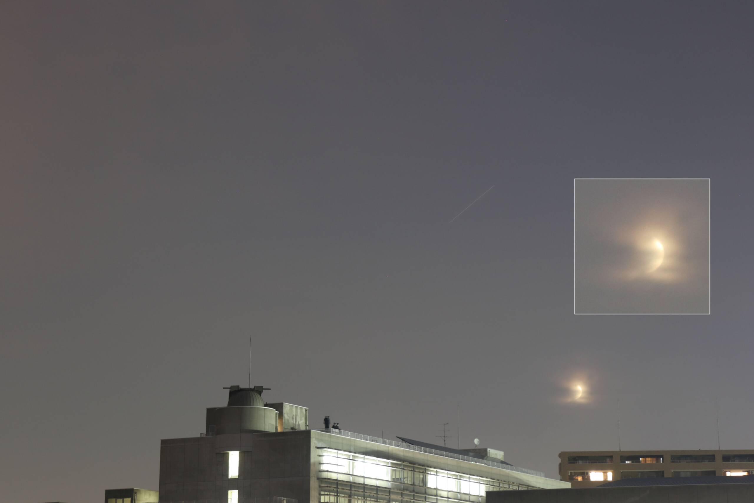 雲の中で月は見えず、辺りを動いて探していると薄っすらと建物の近くに明るい領域に気が付きました。月の明かりです。見えたり消えたりする中で方向を決め撮影。月の明るい領域以外はすばるも何も見えません。