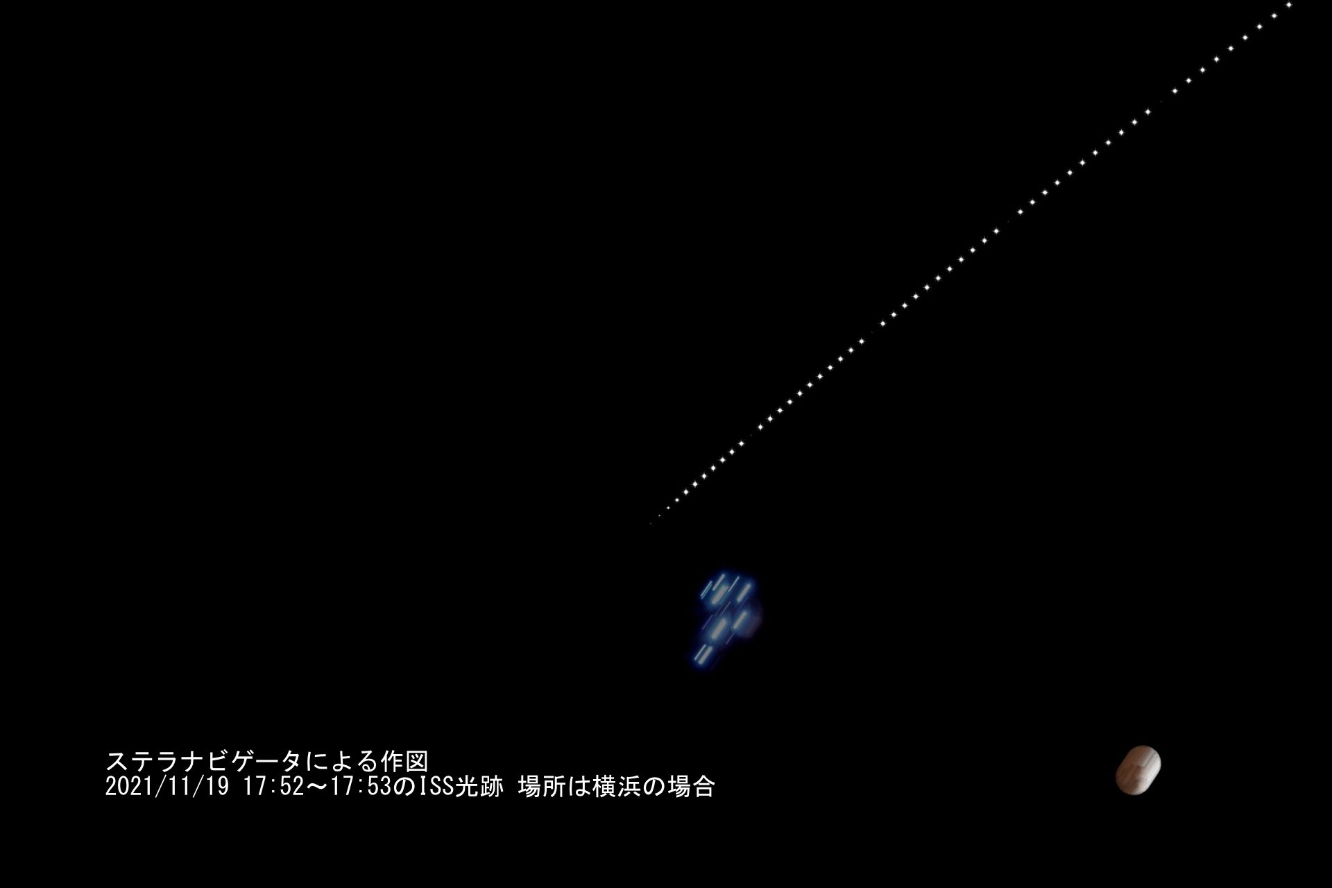 ISS光跡と月食 2021/11/19 17:12~17:13 EOS M6 ISO-200 f/5.6 53mm 10秒露光、2秒間の繰り返し撮影 比較明処理して明度等調整