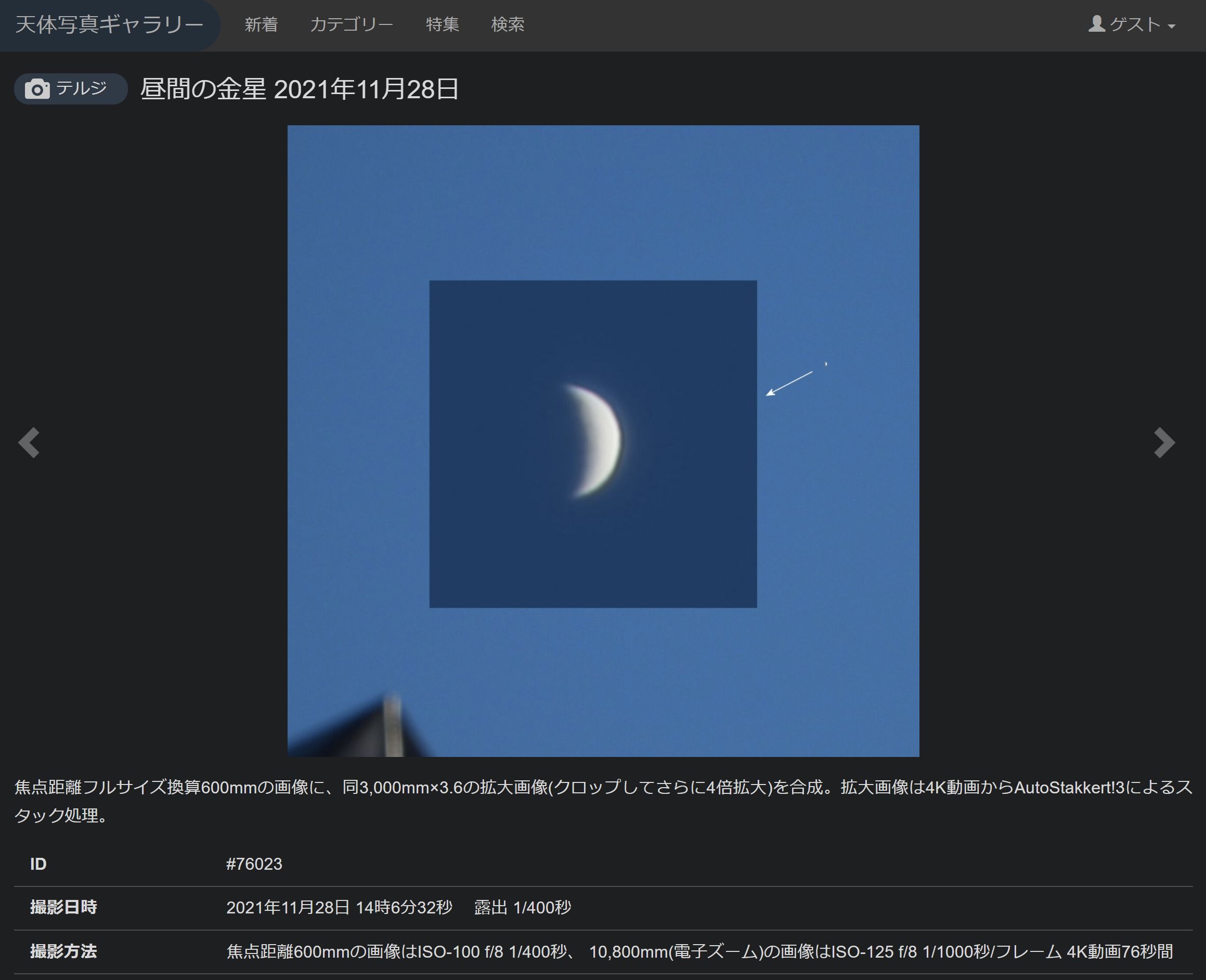 最初にAstroArtsのギャラリーに投稿した画像を示します。金星内合が来年1月9日です。年末まで現在の視直径よりも2倍近くと大きくなり、一方さらに細くなった金星が見られます。内合に近づくにつれて年末まで水平月ならぬ水平金星、水平明星が撮れる(水平は無理としても細い横になった金星。あまりに細くなって写せるのかどうかはわかりません)と面白い。以下、当日の撮影記録を示します。
