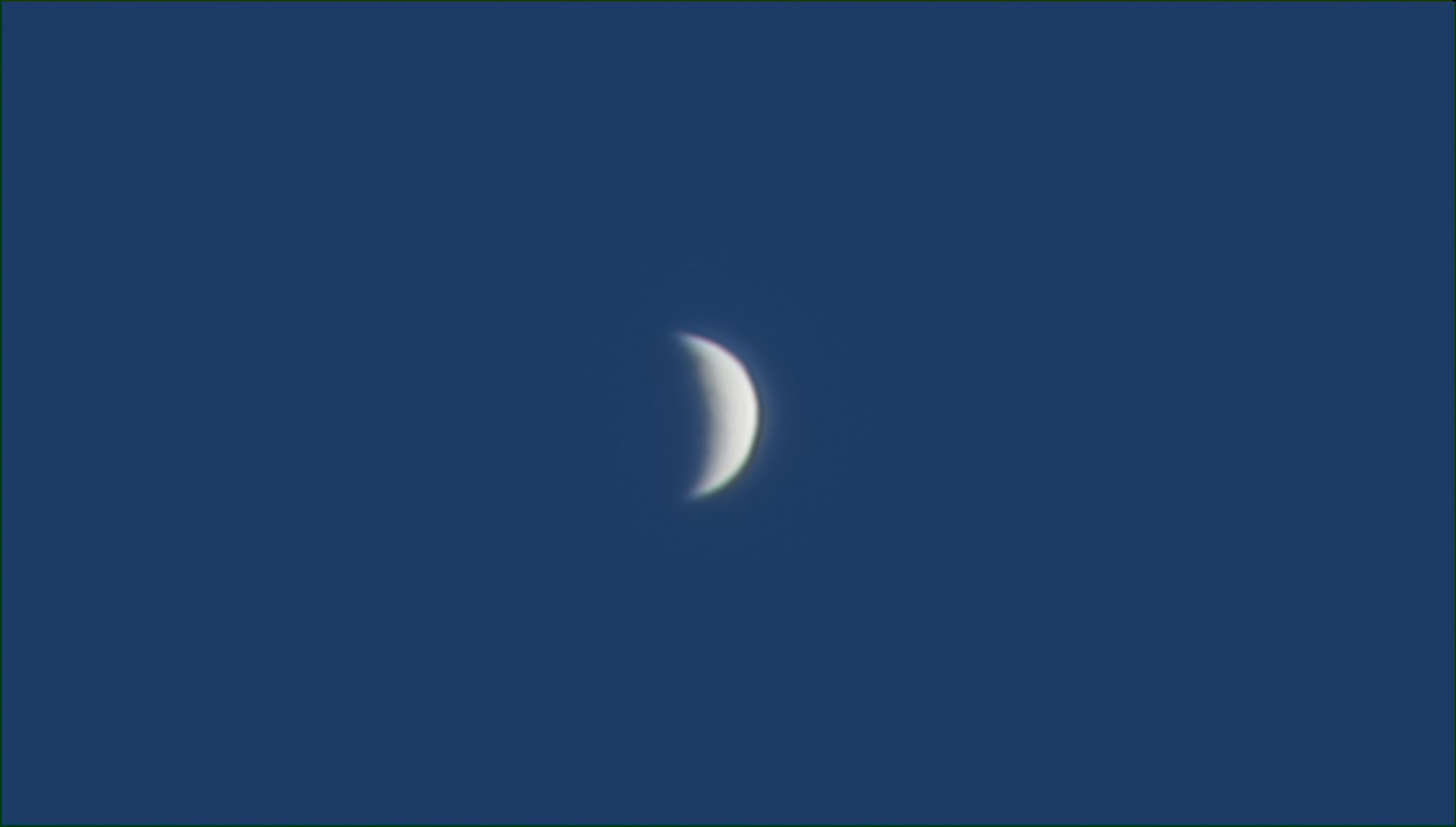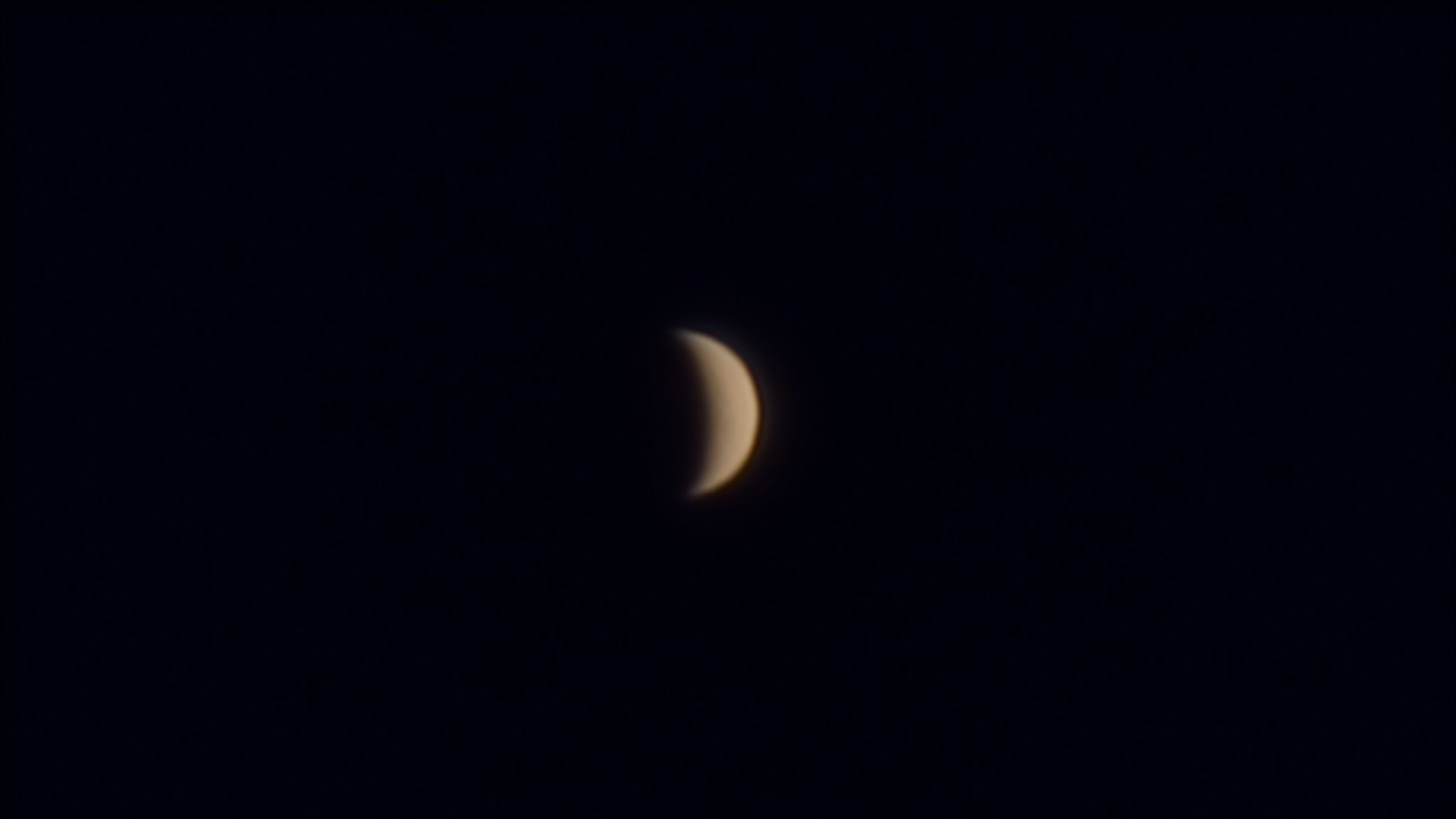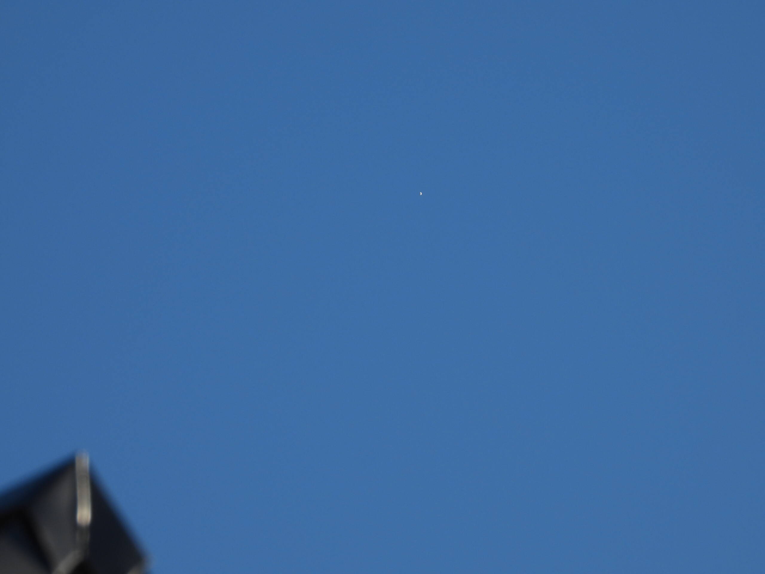 青空に小さな光る点だけでは面白くないので、目標物とした隣家の屋根の一部と共に収めました。一見、普通の青空の中に光る点と思われますが、600mmですからこれでもかなりの倍率です。金星にフォーカスを合わせていますので建物はかなりボケてしまいます。600mmの写野が連想できれば、こんなに小さいのかと思われるかも知れません。光る点を引き伸ばすと三日月状に見えるようになります。
