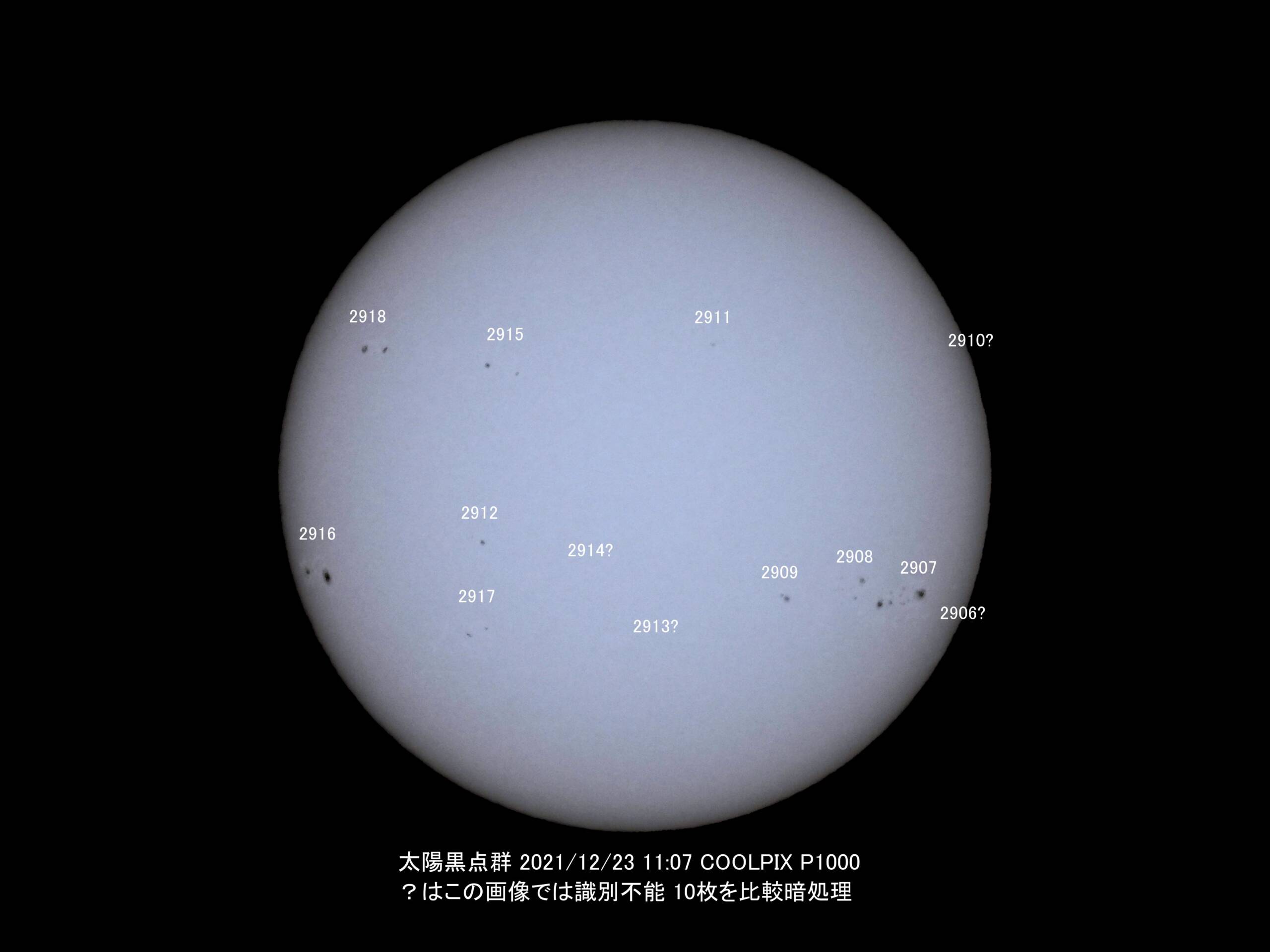 どんどん増えています、黒点が。大きな黒点と違って、数が多くなるのも活動に関係しているのか。今まで一日で見えた黒点の最多数はいくつなんでしょう?。今日は採番が13個ですけれど、黒点として見えたのはこの画像では9個。 晴れなのですが、大気の影響のためか一度に全部の黒点、特に薄い黒点は写っていませんでしたので10枚まとめて比較暗で。太陽直視は危険です。 COOLPIX P1000 ISO-100 f/8 359mm(2,000mm) 1/1250~1/800 ND5