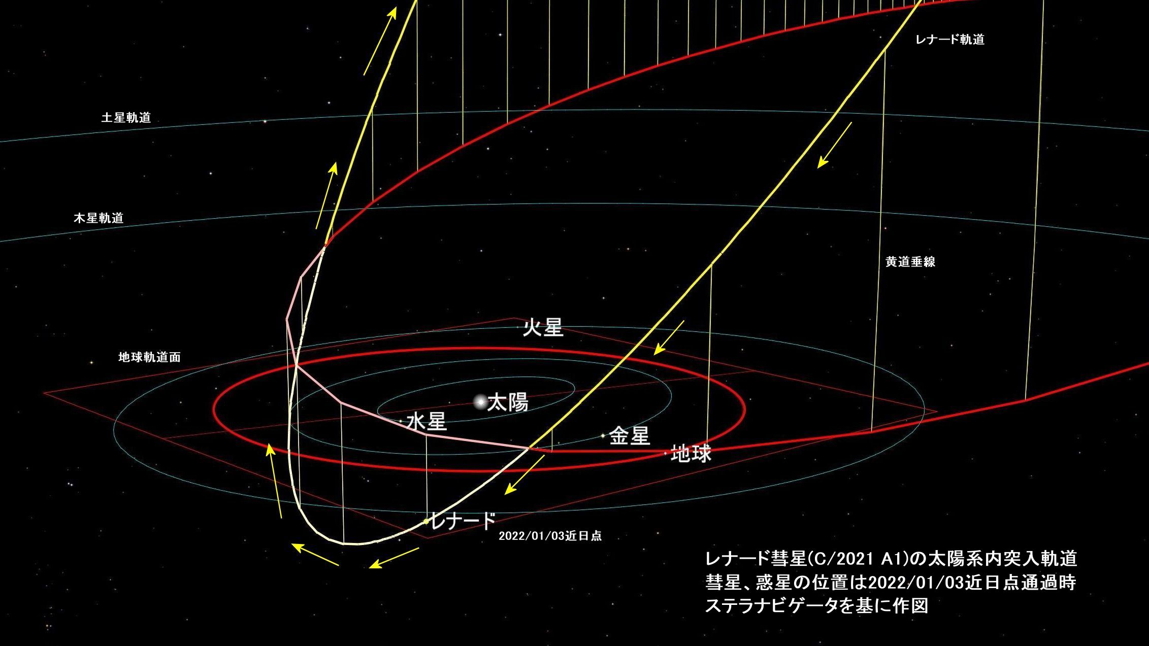 彗星が太陽系内でどのようなコースを進んで、遠ざかるのか、自身用になりますがステラナビゲータで確認しました。ネットで検索すると他にもありますが、二次元表示だとわかりにくい。軌道表示している例としてウィキペディアのページがありました。二度と近づかない彗星と説明されています。